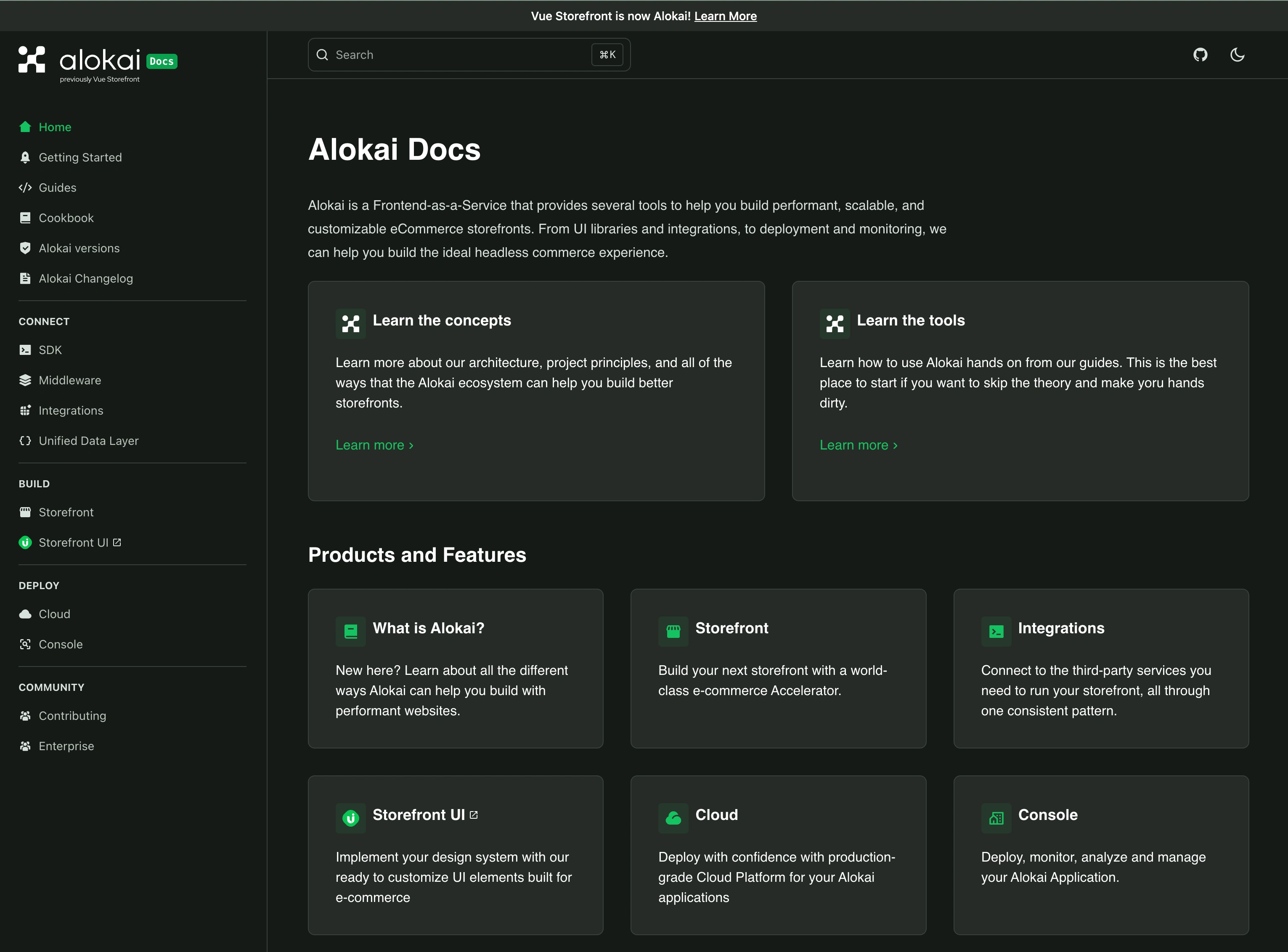 Alokai (formerly Vue Storefront) is a leading composable commerce platform used by enterprise eCommerce teams. I was hired to modernize the developer experience, which at the time suffered from outdated docs, manual onboarding steps, and unclear implementation flows.