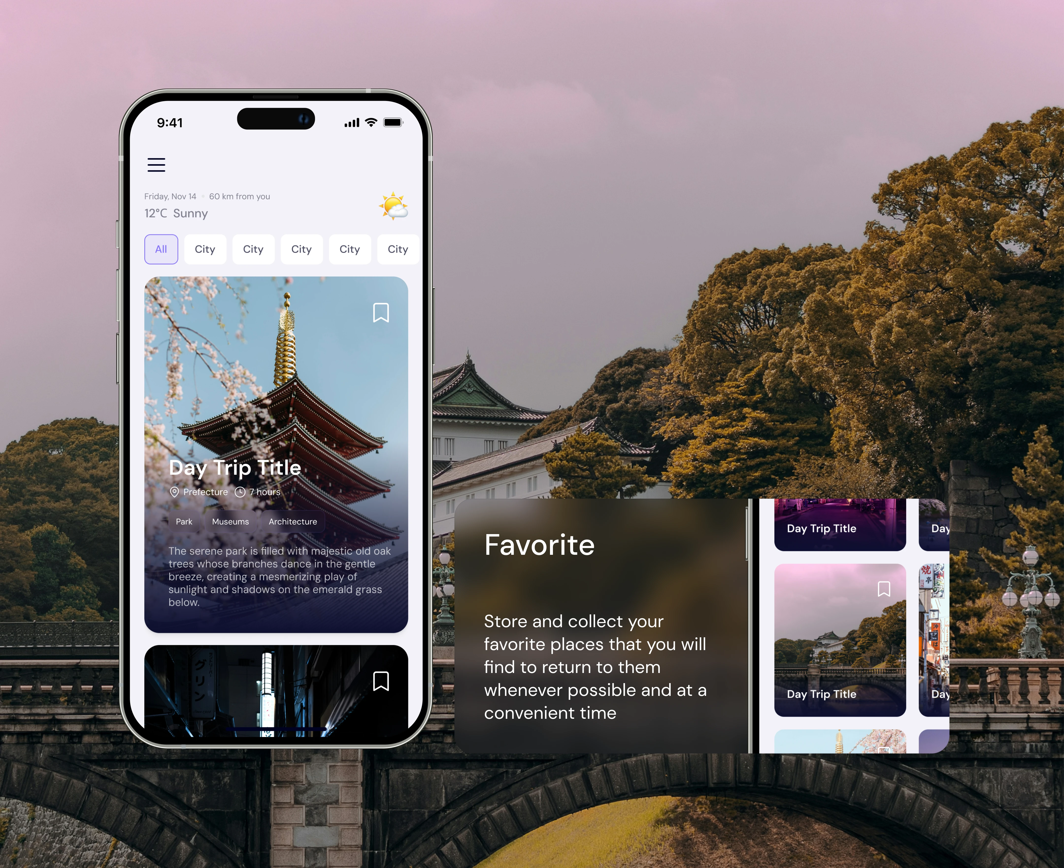 Designed a travel discovery app for exploring day trips, saving favorite places, and planning getaways based on weather and distance