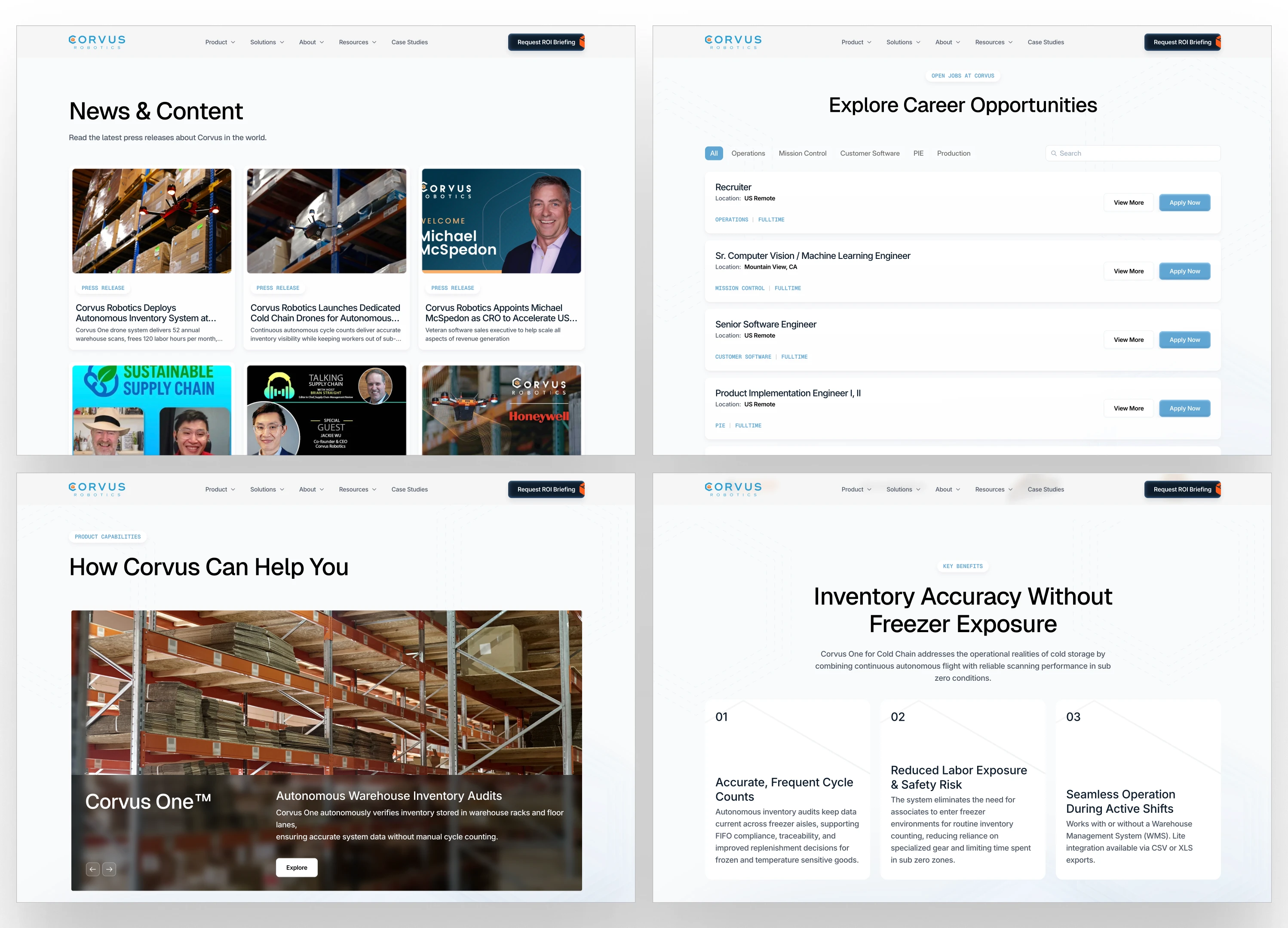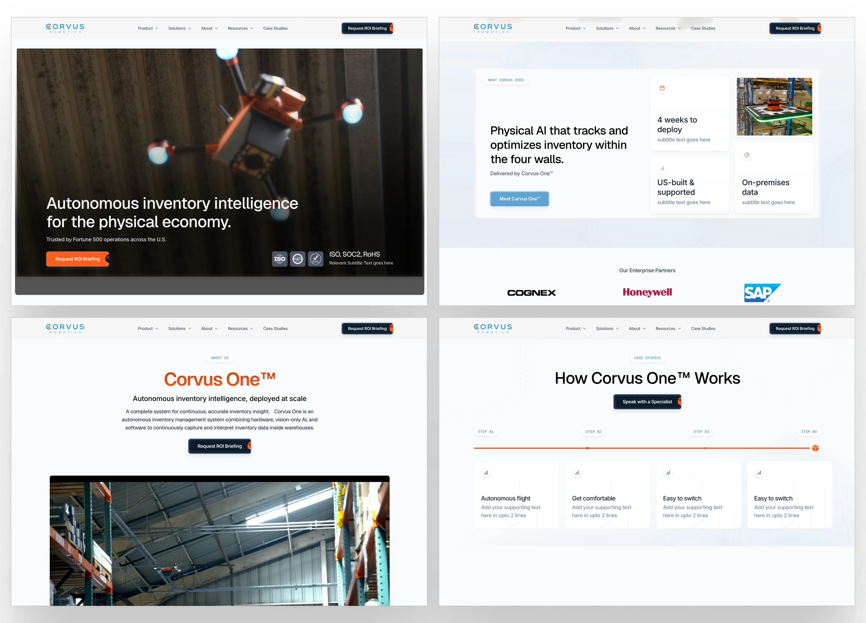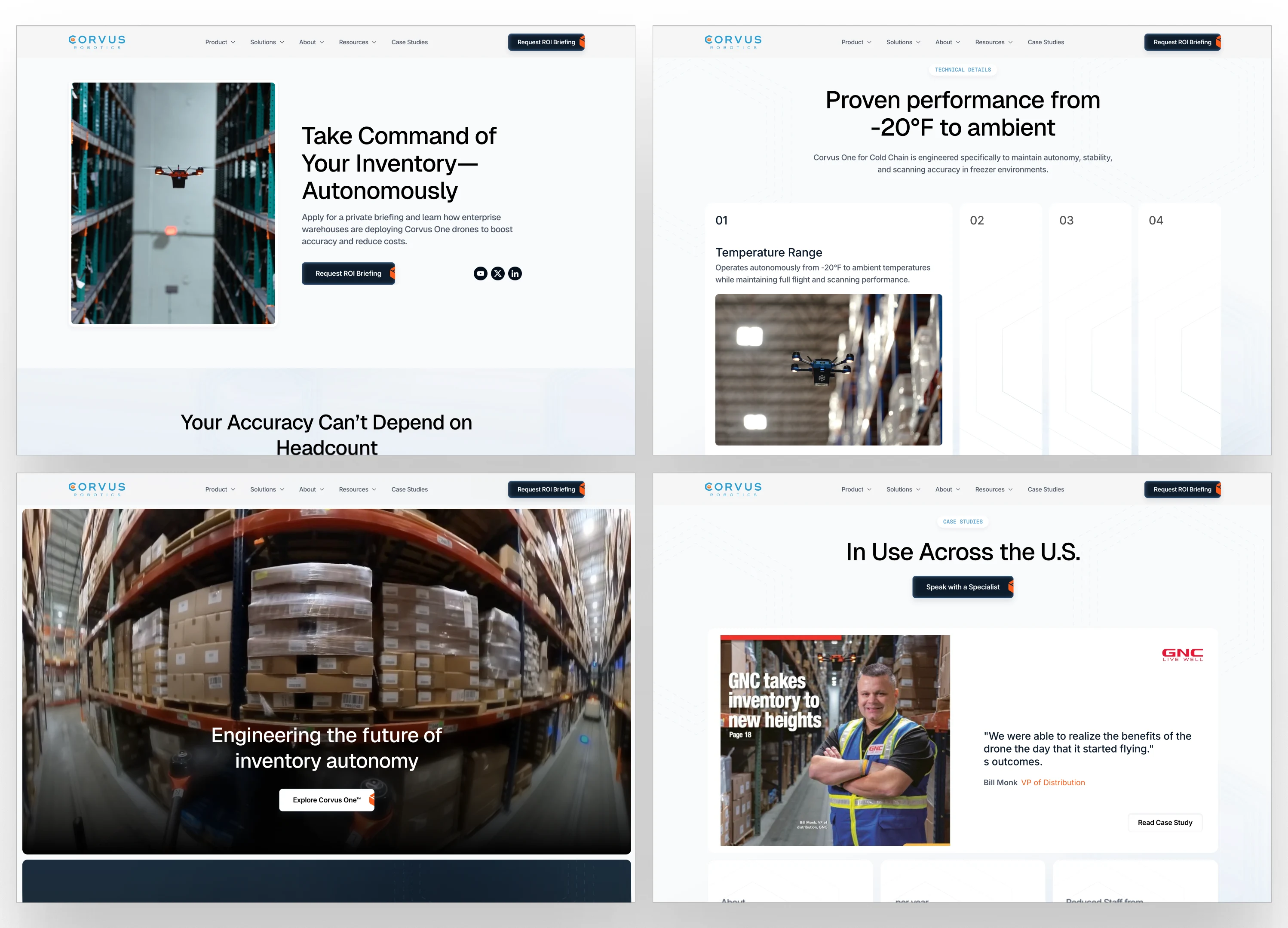 The website sold Corvus One like it was the only product. The positioning leaned on drones as the story, not the outcome. The visual language was built for a single product demo, not a three-product enterprise lineup. The sales motion a new CRO was building — multi-stakeholder, 9-month cycles, procurement involvement — needed a surface that could carry its own weight in the deal.