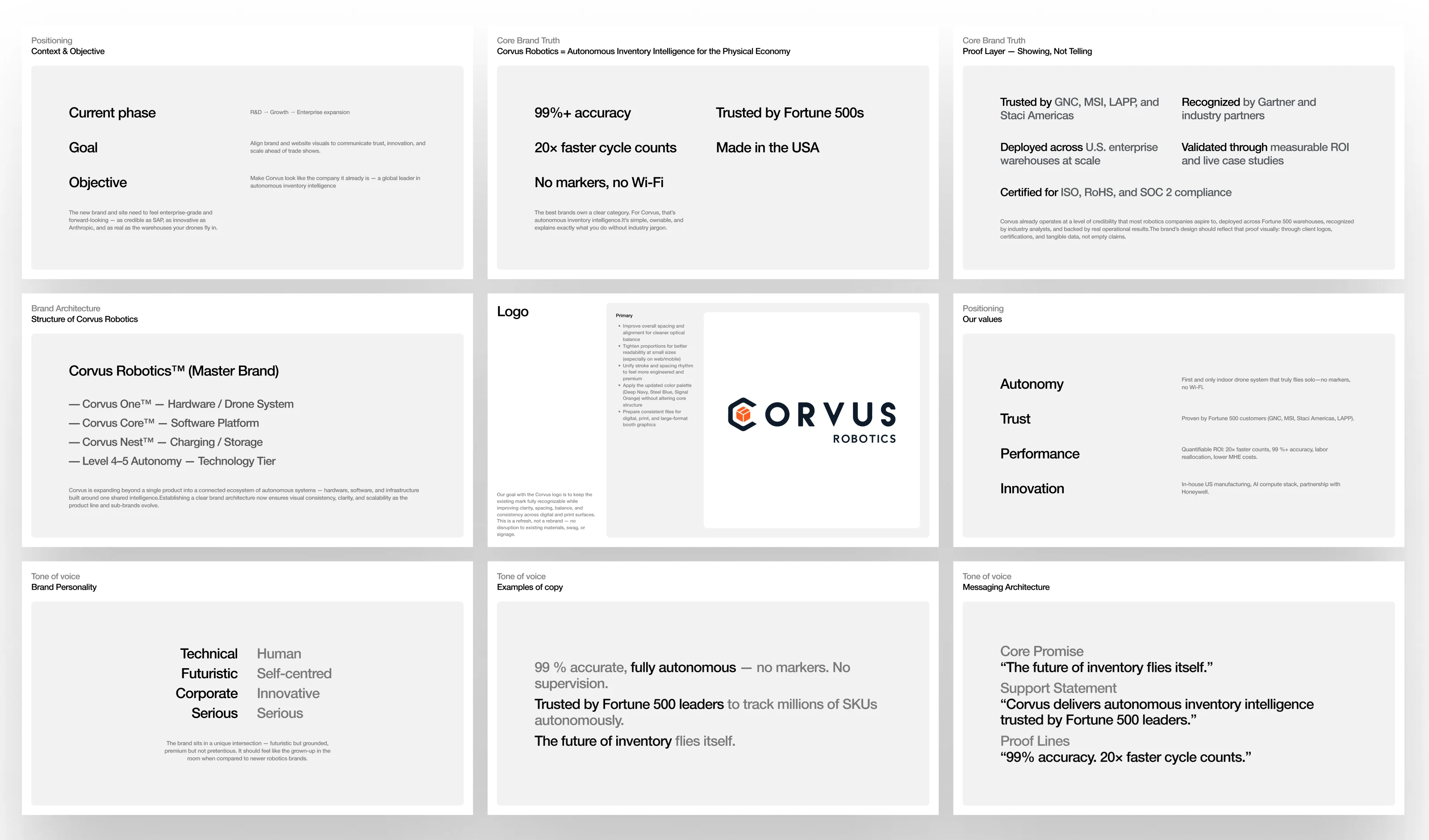 Strategy. New positioning: Corvus as the warehouse automation platform. Narrative framework built around the shift from manual cycle counts to continuous, autonomous inventory intelligence. Messaging hierarchy scoped to three audiences: operators (what changes), IT (what it plugs into), finance (what it costs to not have it).