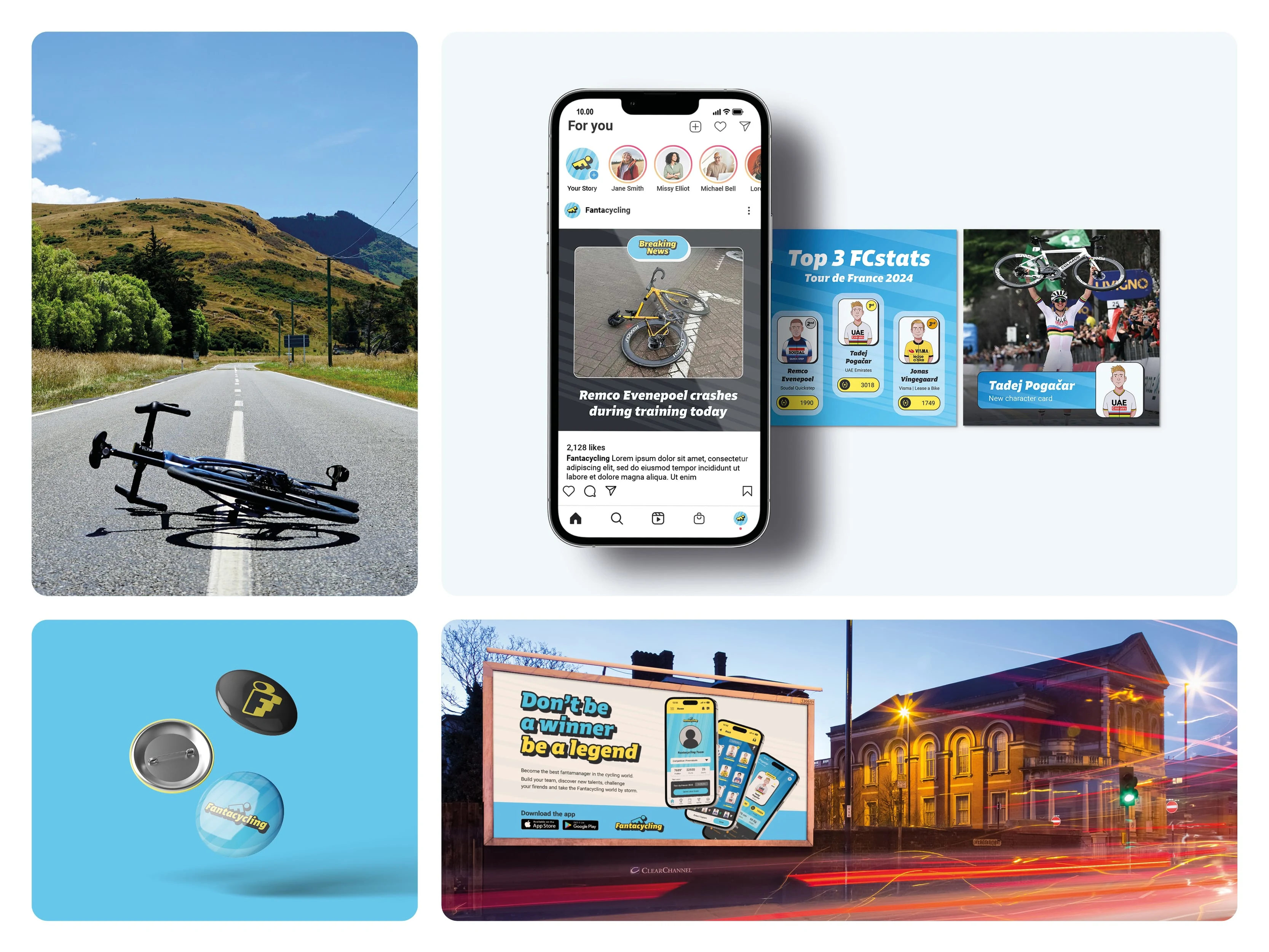 The project received an Honourable Mention in the competition for the rebranding of Fantacycling, standing out for its creativity, clarity and balance between sport and playfulness.