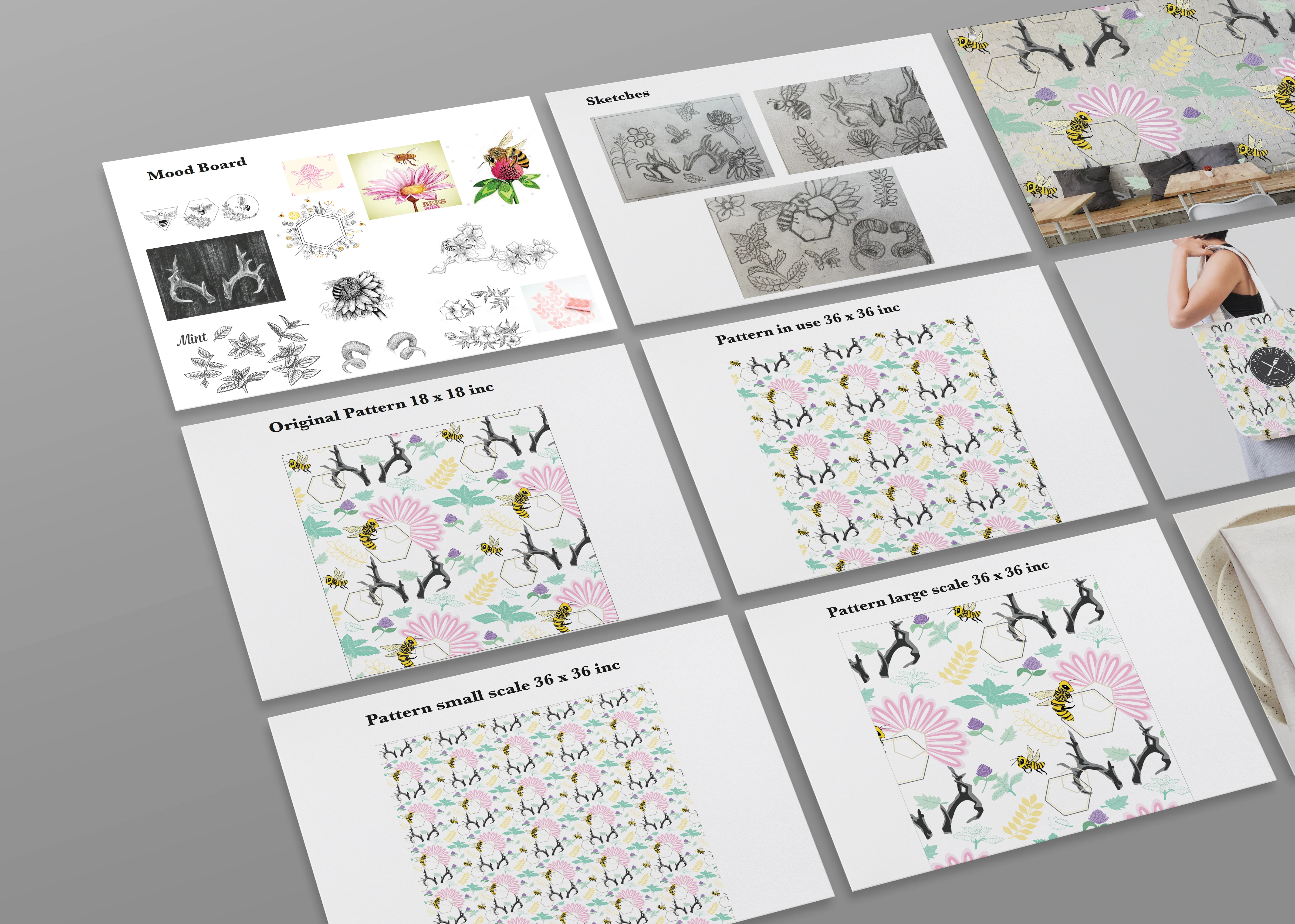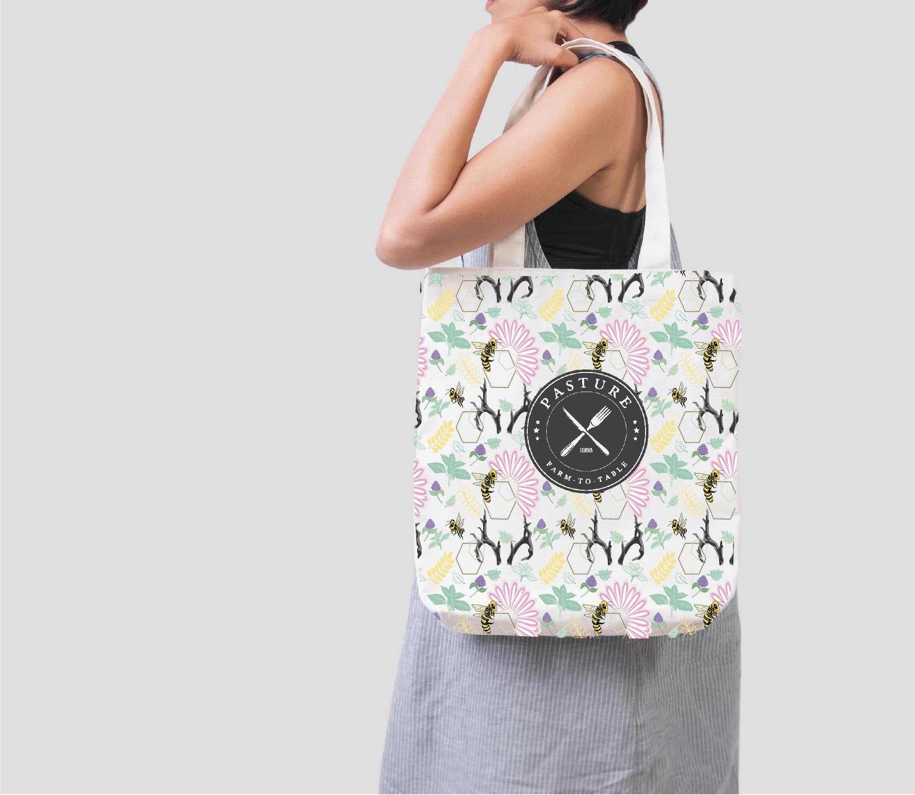 Farm to Table restaurant renovating its space into a chic, rustic space with a warm welcoming feel. The objective was to create a custom pattern for strong brand recognition and to utilize across several platforms in their space and materials. Some materials include: a feature wallpaper wall, material for reusable napkins and t-shirts, tote bags, and packaging. The client desired for the pattern to have a unique earthy feel.
