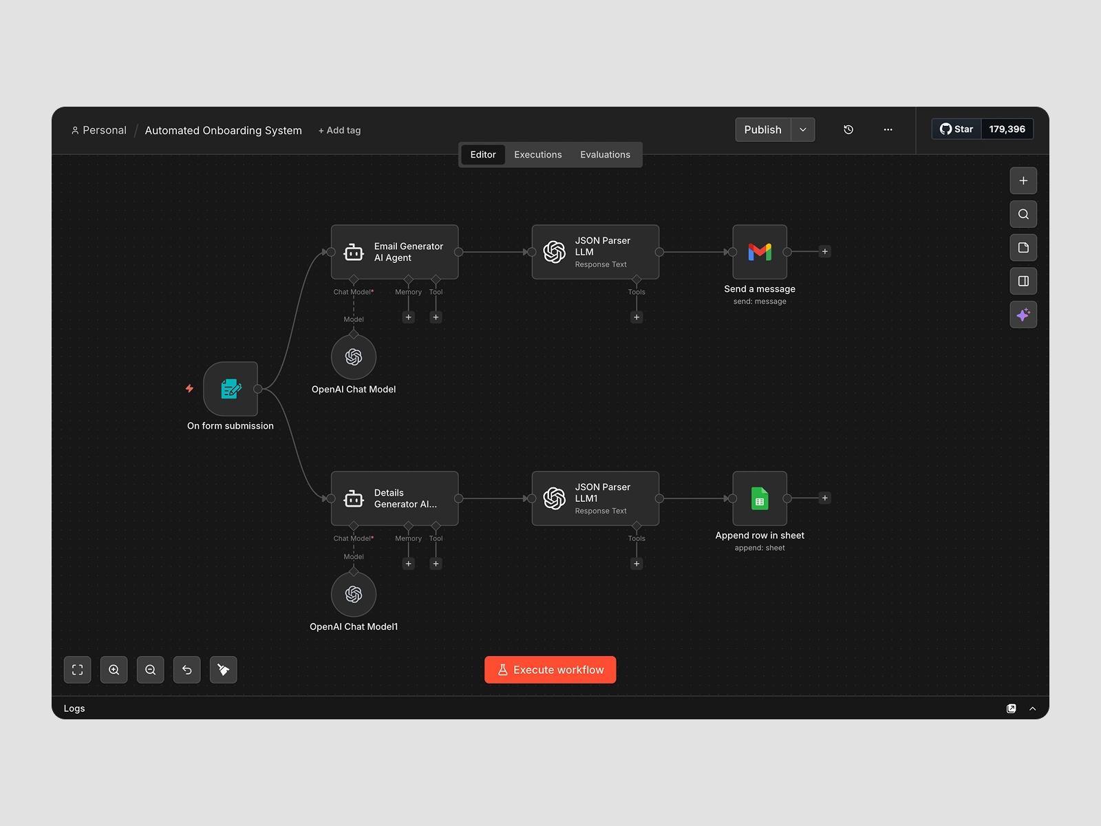 The first branch takes the client's name, email, industry, and goals, feeds them into an AI Agent, and generates a personalized welcome email. A second language model node parses the output into clean JSON fields, which are then mapped directly into a Gmail send node. The client receives a tailored, professional email without anyone lifting a finger.