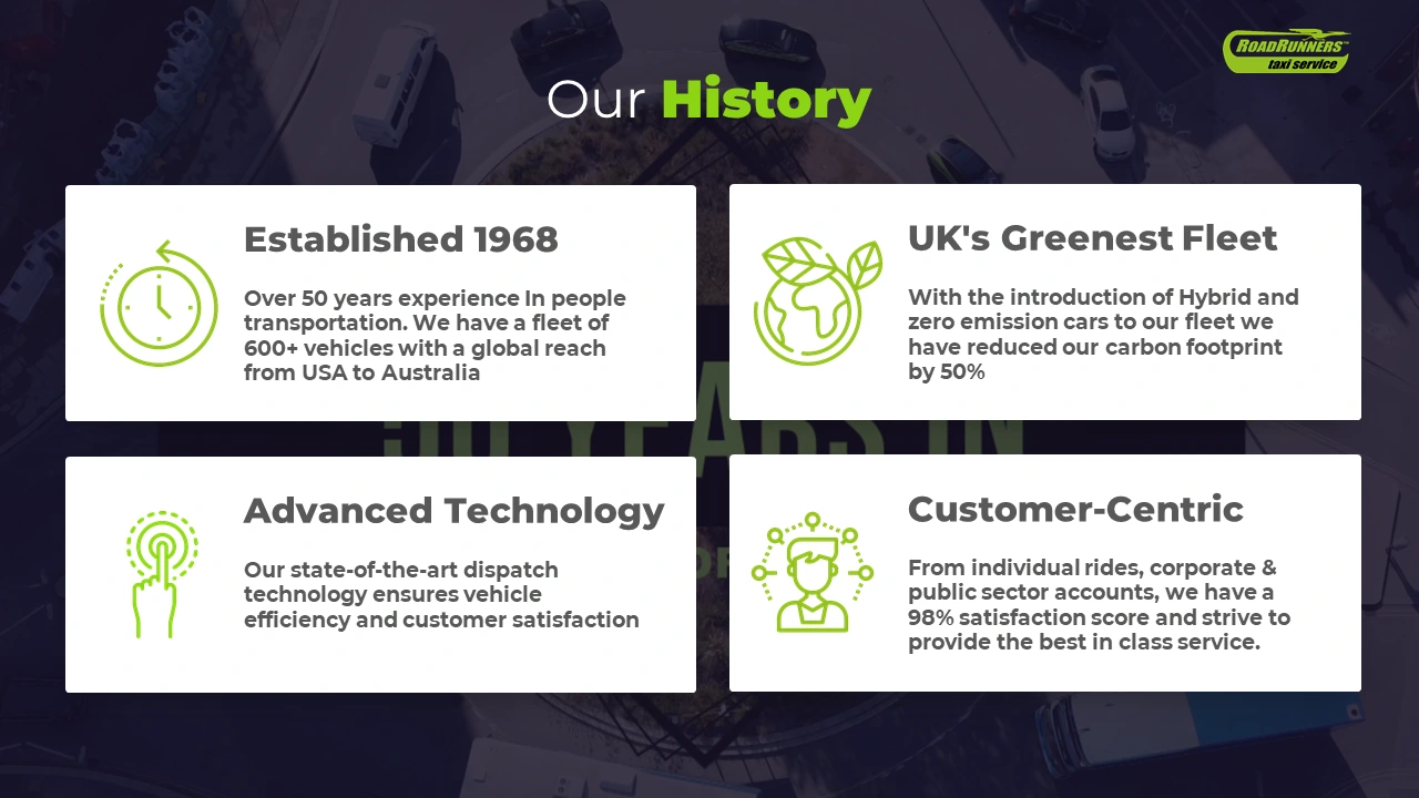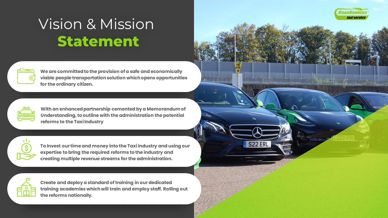Developed presentation content outlining a people-focused transportation initiative committed to safe, reliable, and economically viable taxi services.