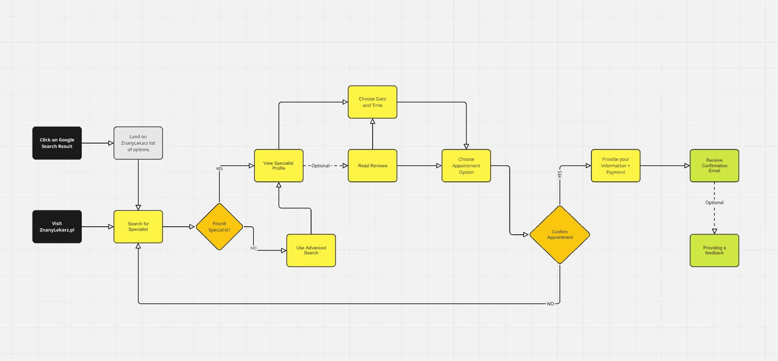 This user journey highlights the streamlined and user-friendly process on ZnanyLekarz.pl, from initial search to post-appointment feedback, ensuring a positive and efficient experience for all users.