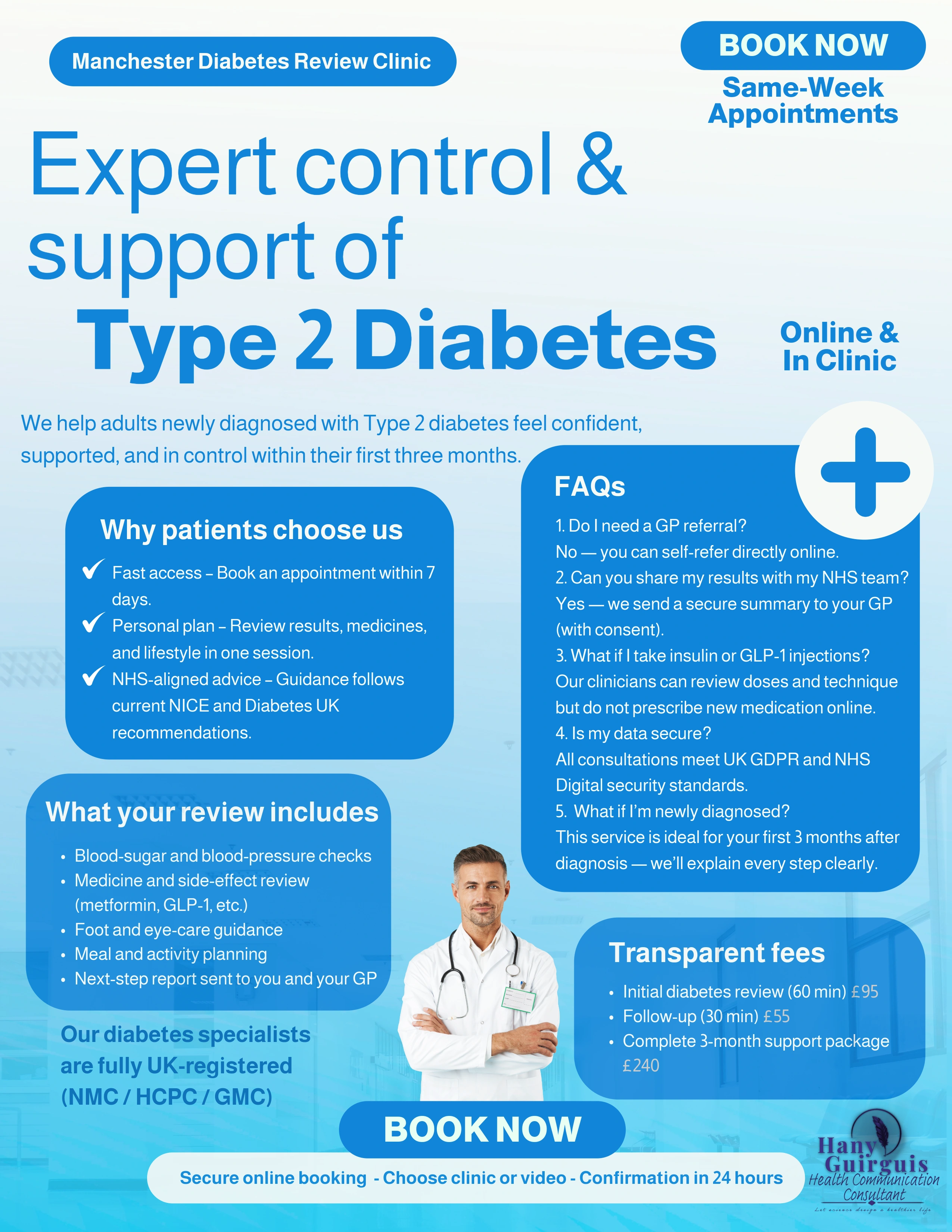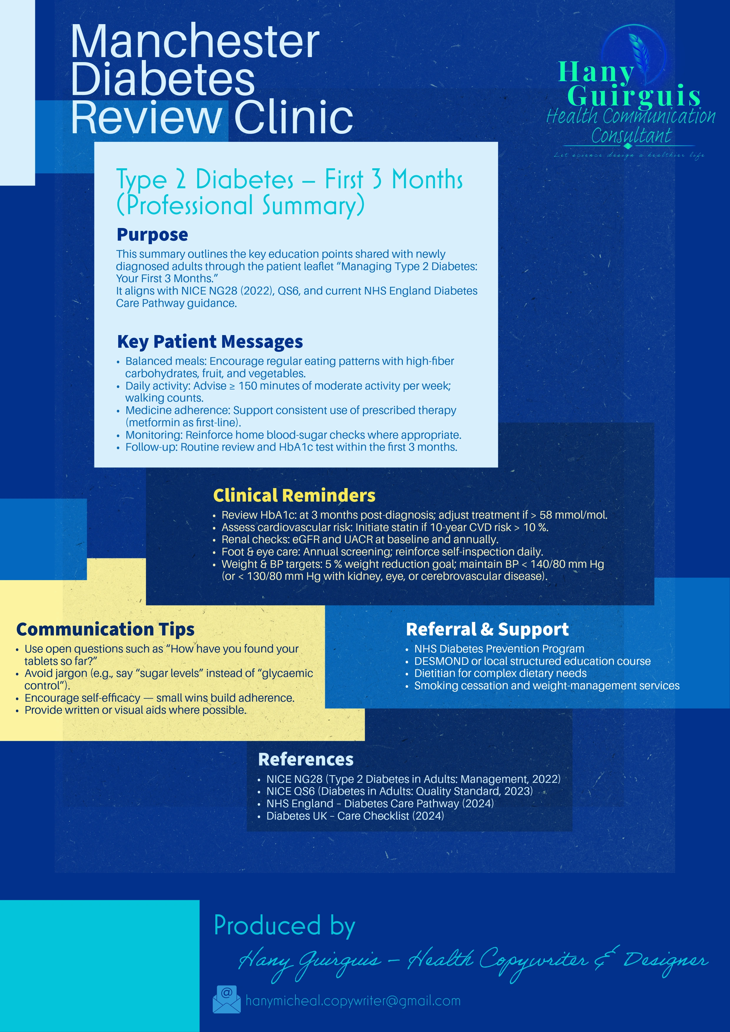 This project translates clinical recommendations for Type 2 Diabetes into a clear, structured educational visual β designed for use in patient counselling, clinics, and health programmes.