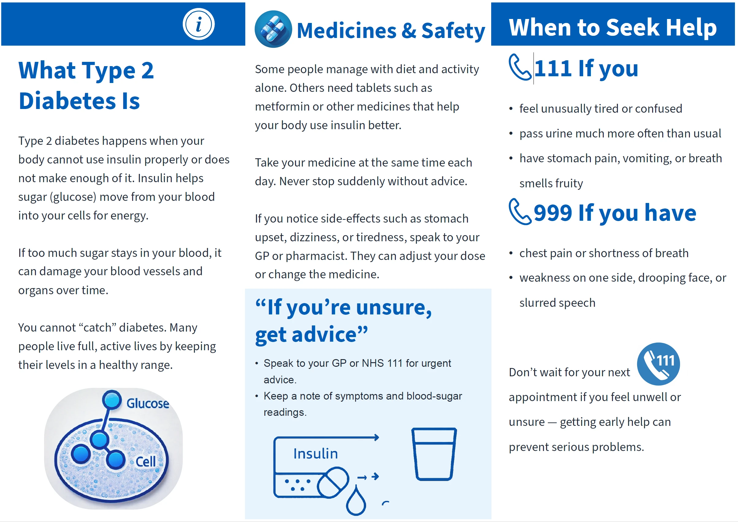 Clear signposting to diabetes programmes, education services, and follow-up pathways.