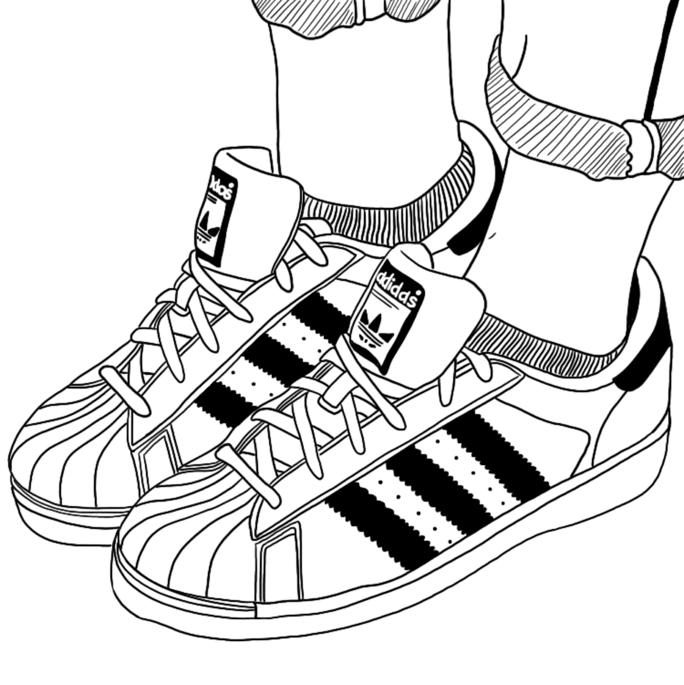 Created a detailed black-and-white line drawing of Adidas Superstar sneakers, focusing on texture, symmetry, and brand identity in a minimalist style.