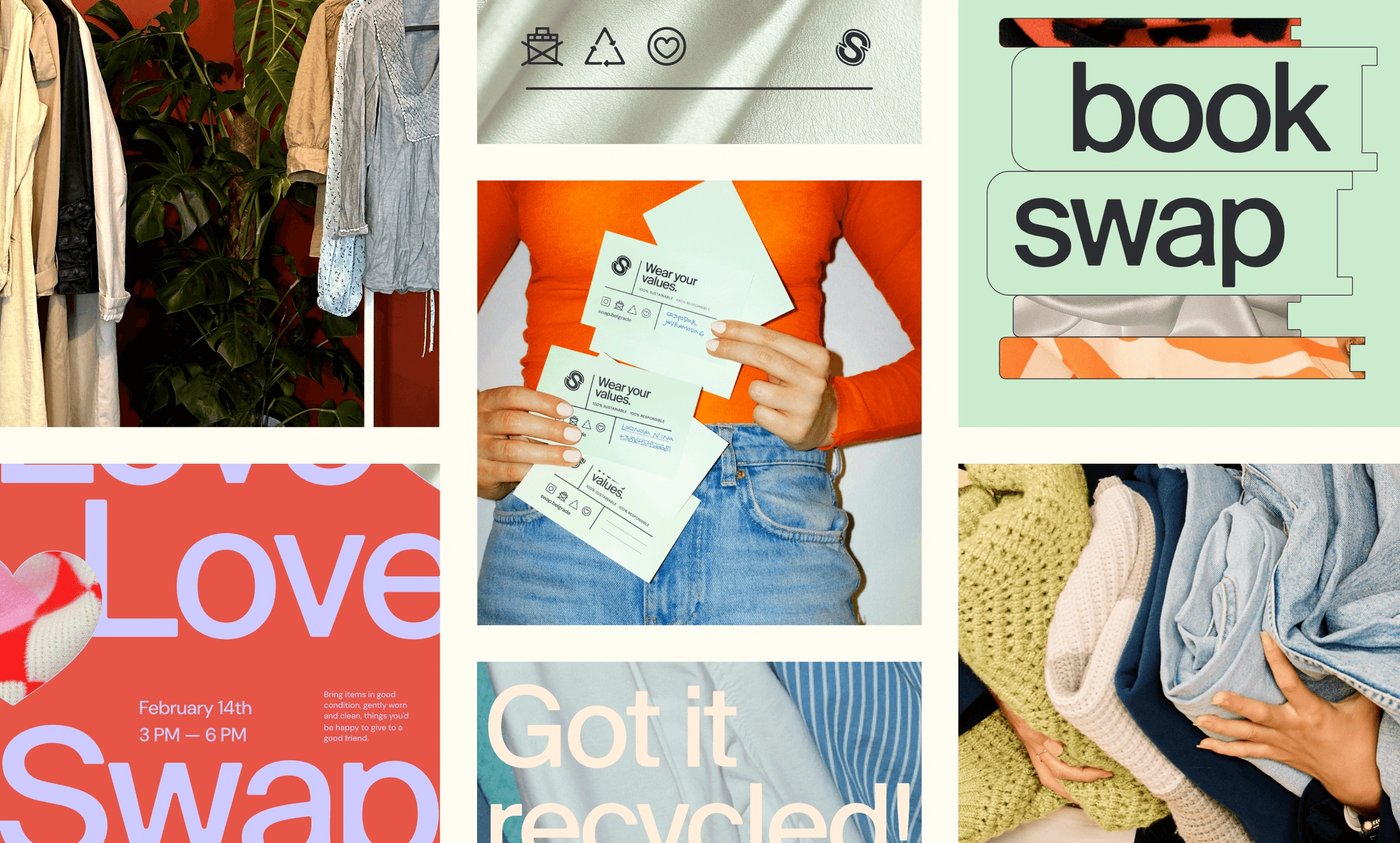Cozy swap event brand identity. Gentle retro warmth, flexible fabric-based system, care-label-inspired icons and layouts reflecting community values ✦