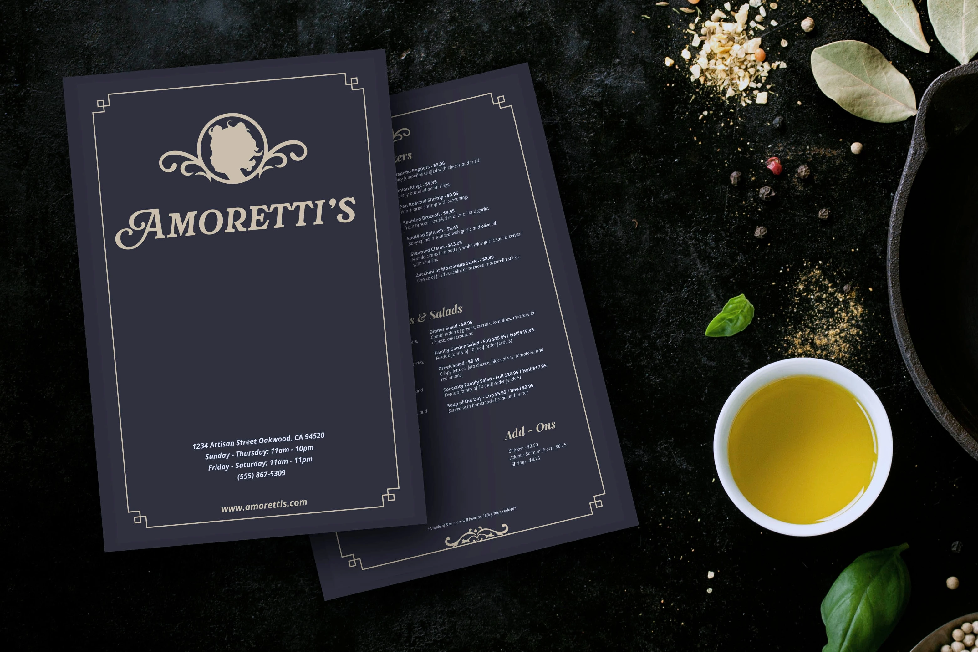 Amoretti’s is a fictional Italian restaurant concept built to explore a refined hospitality-focused brand identity system. The goal was to create a timeless visual language that feels warm, elegant, and grounded in classic Italian dining. The project includes the core brand identity, a full website homepage design, business cards, a dinner menu, and a specialty drink menu.