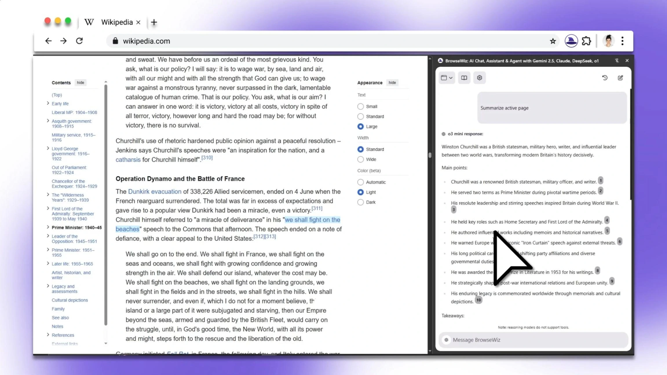 The visual identity developed for this Chrome extension corresponded to the idea of a magical assistant living in the sidebar, always ready to help using various AI for different purposes.