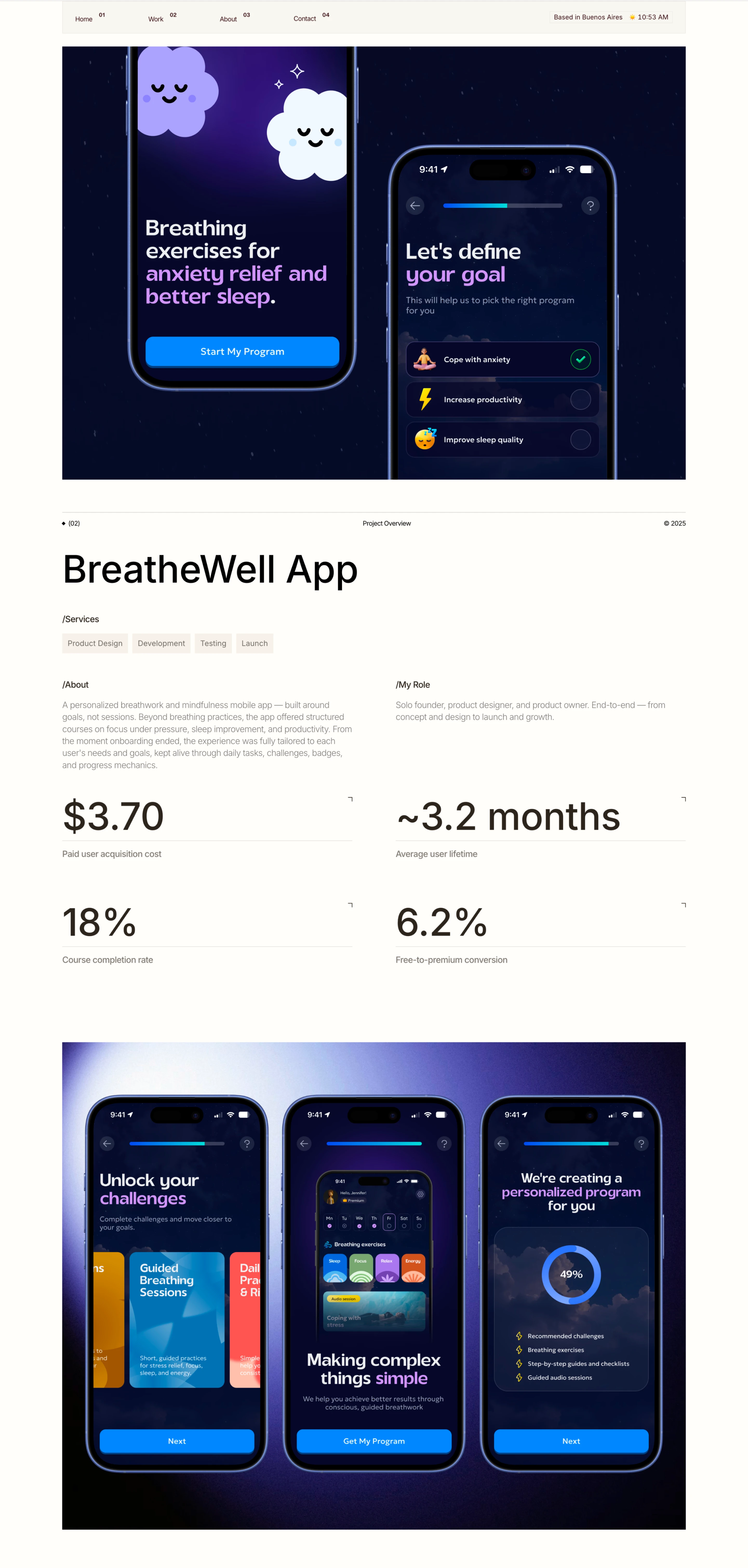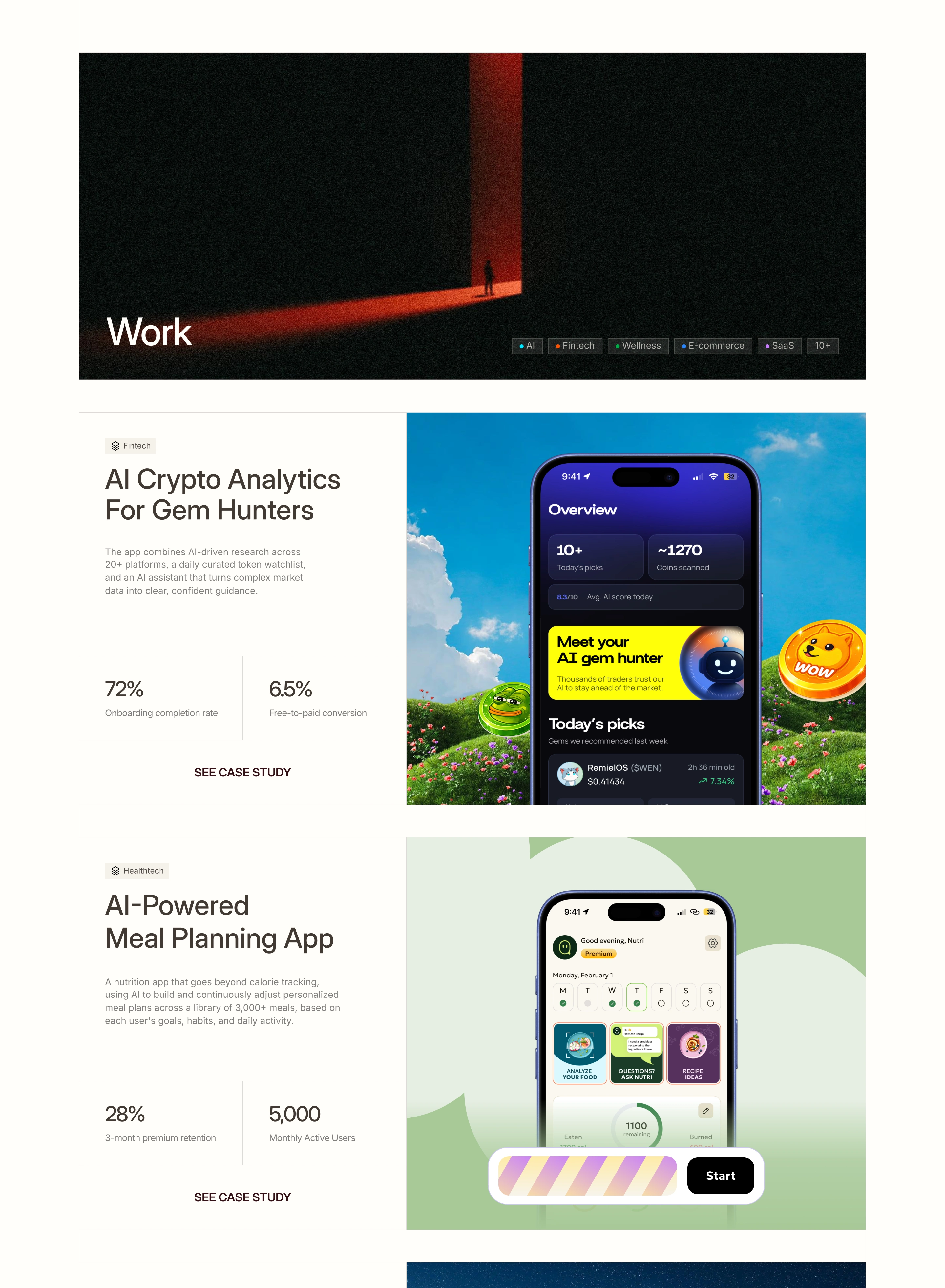 I stripped everything that wasn't essential. No fluff, no lengthy process sections. The new portfolio leads with the work — apps, SaaS products, marketing sites — and backs it up with real metrics immediately. Onboarding completion rates, conversion numbers, MAU. The kind of proof that makes a founder stop scrolling.