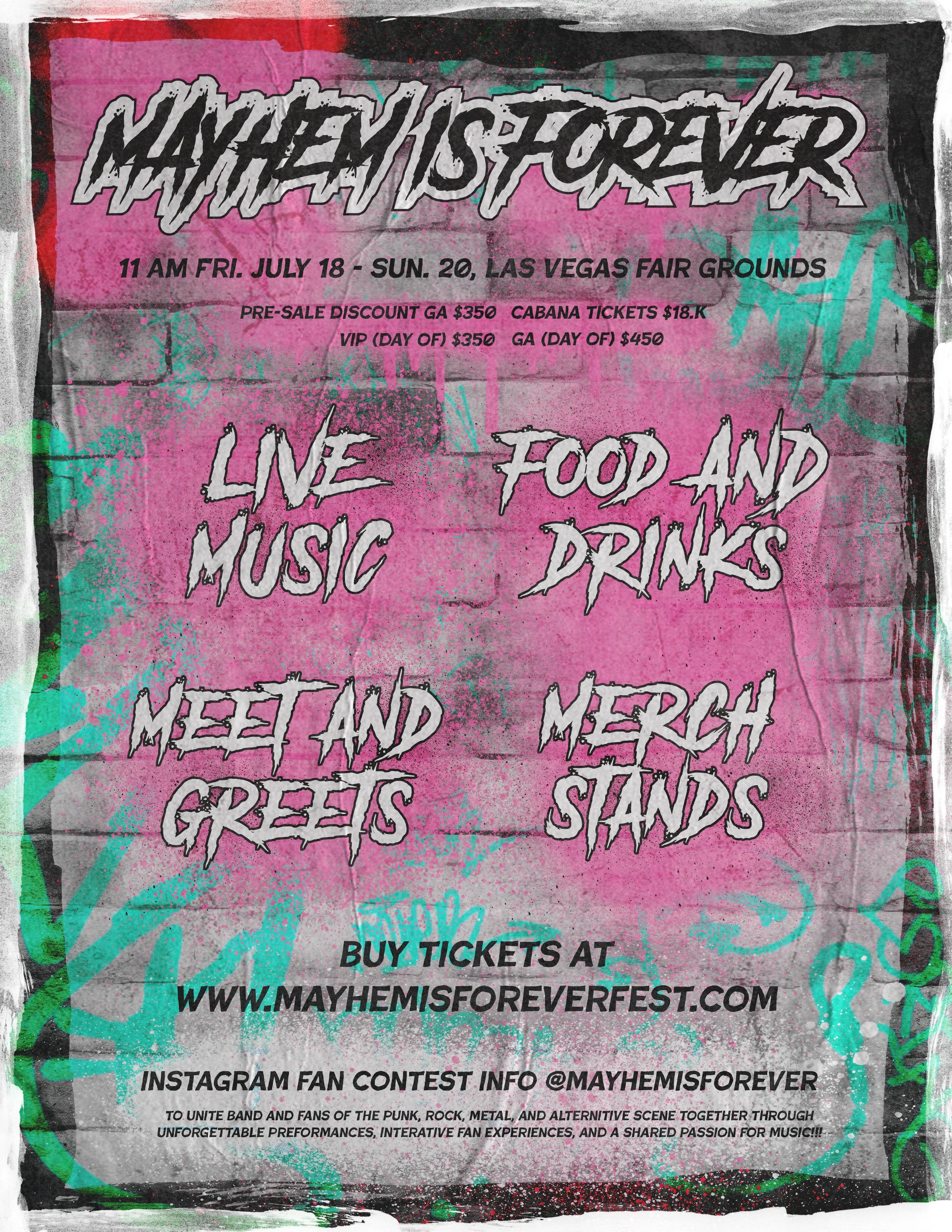 Mayhem is Forever is a made up 3 day punk rock music festival. The goal of these posters is to advertise tickets for this summer event and call attention to punk rock and music festival enjoyers! This poster was designed in Adobe Illustrator and Photoshop.