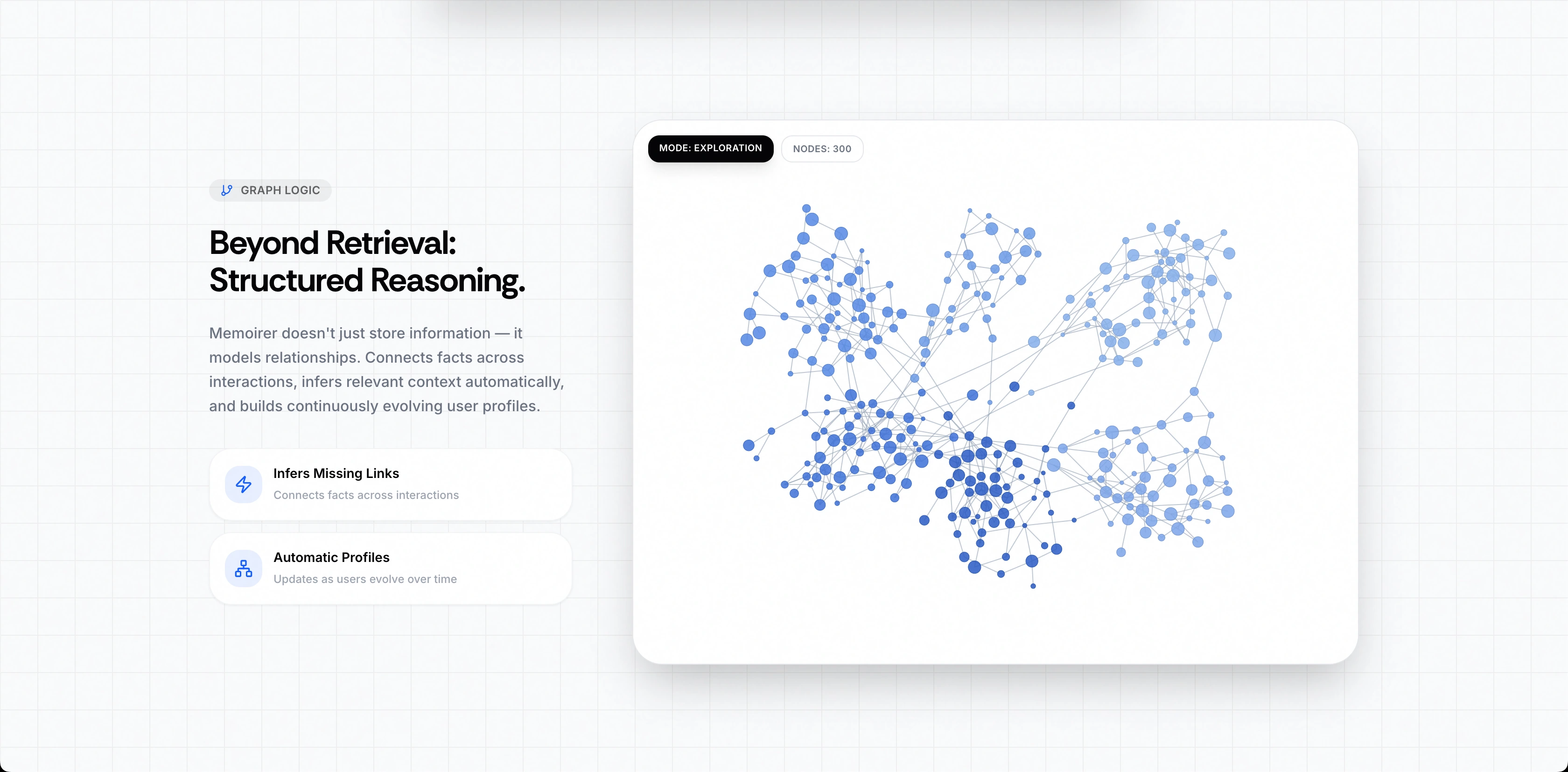 Memoirer is a latency-first intelligent memory layer that performs multi-hop reasoning, retrieves facts with citations, and answers complex queries in under 100 milliseconds.