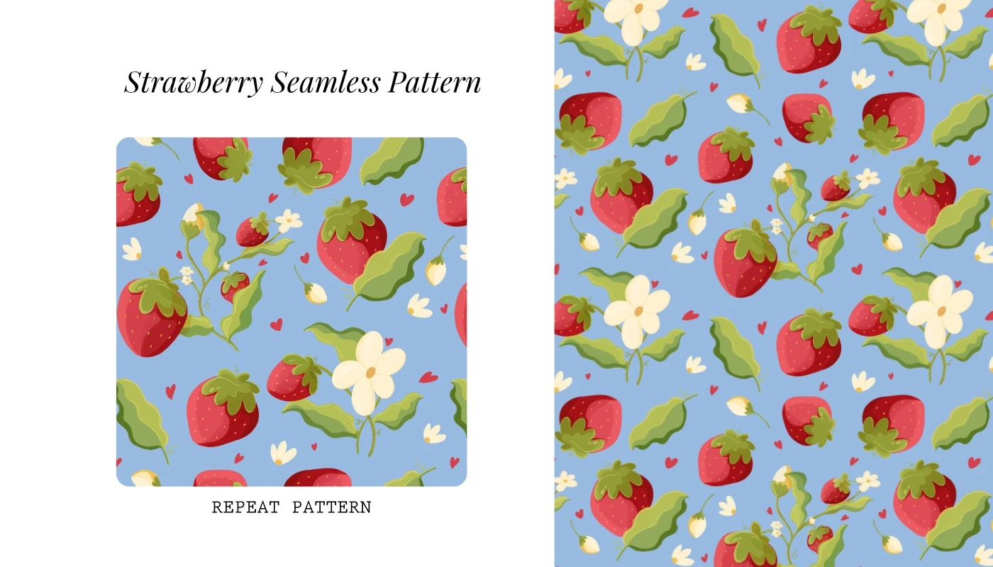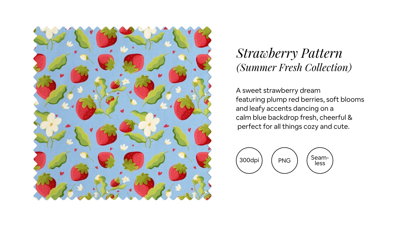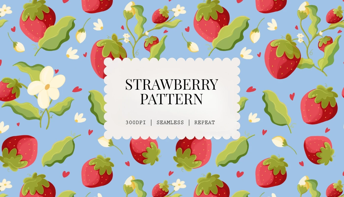 This is a sweet, cozy strawberry-themed seamless pattern Inspired by soft summer mornings, strawberries,leaves, & delicate blooms.