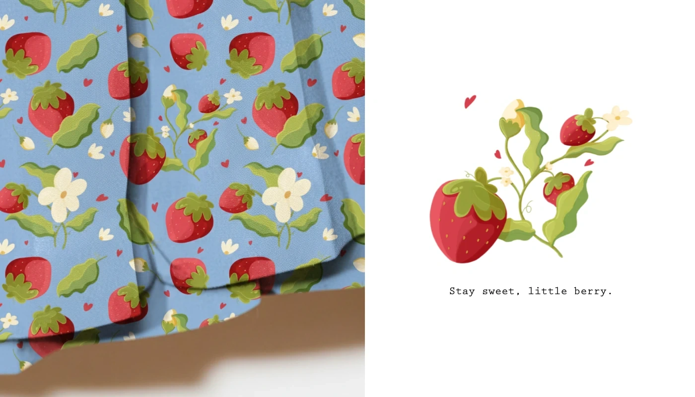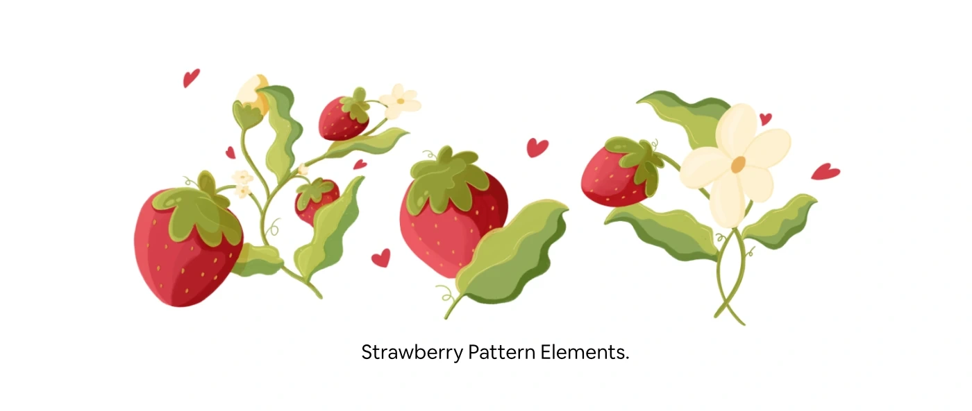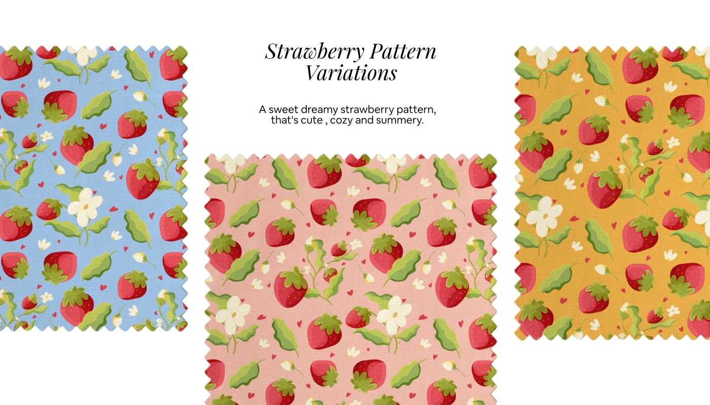 This is a sweet, cozy strawberry-themed seamless pattern Inspired by soft summer mornings, strawberries,leaves, & delicate blooms.