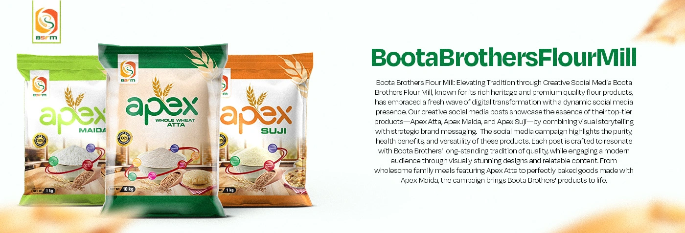 I created Boota Brothers Flour Mill’s social media—blending tradition with creativity to showcase Apex Atta, Maida & Suji through pure, healthy storytelling.