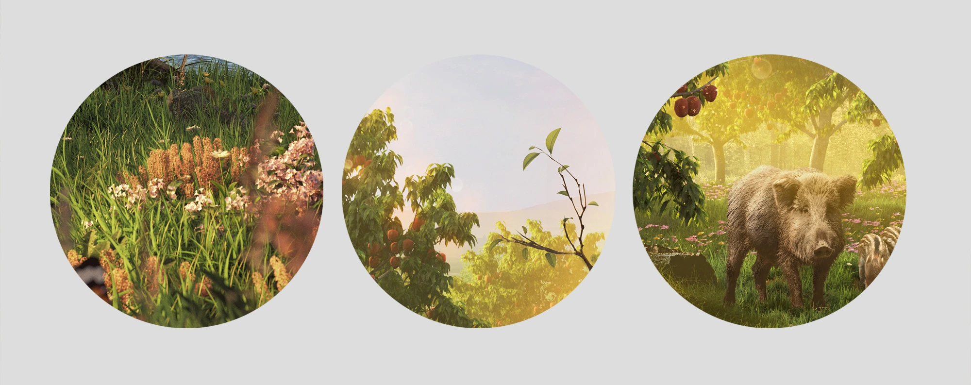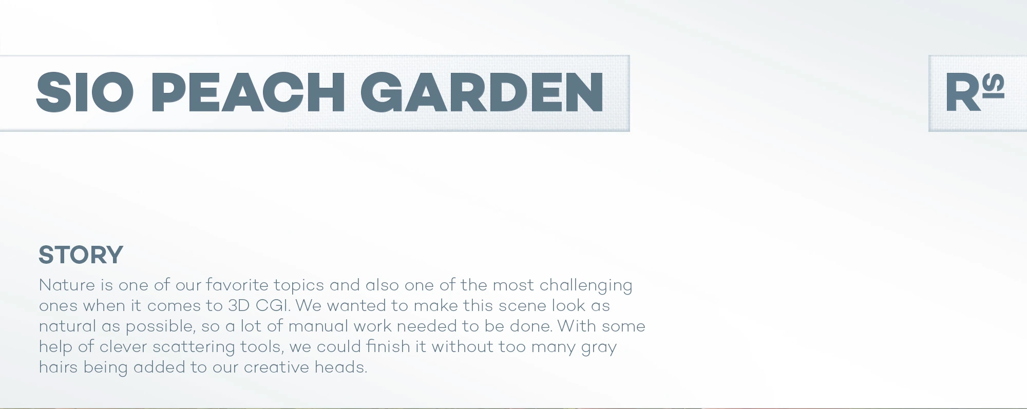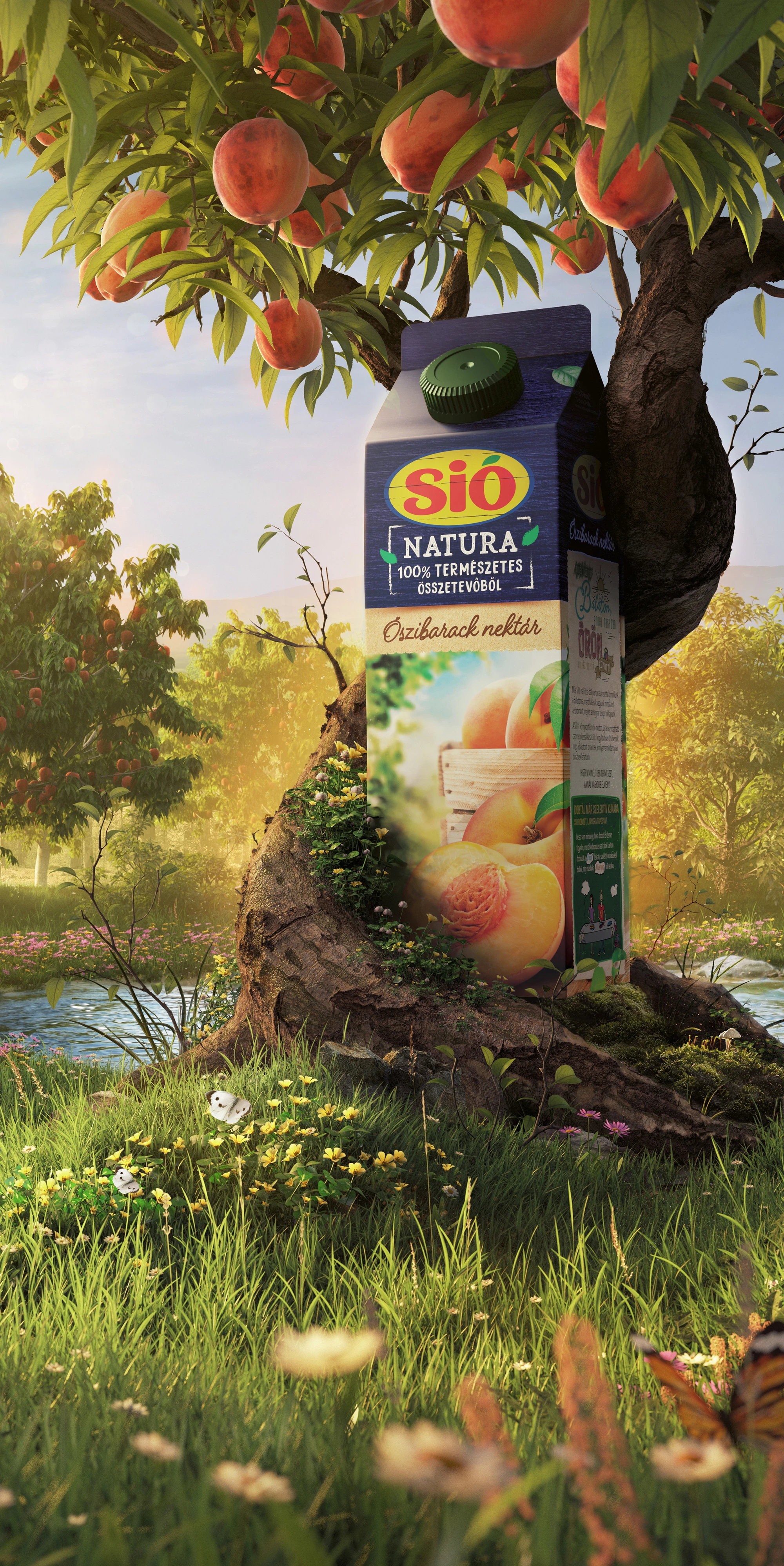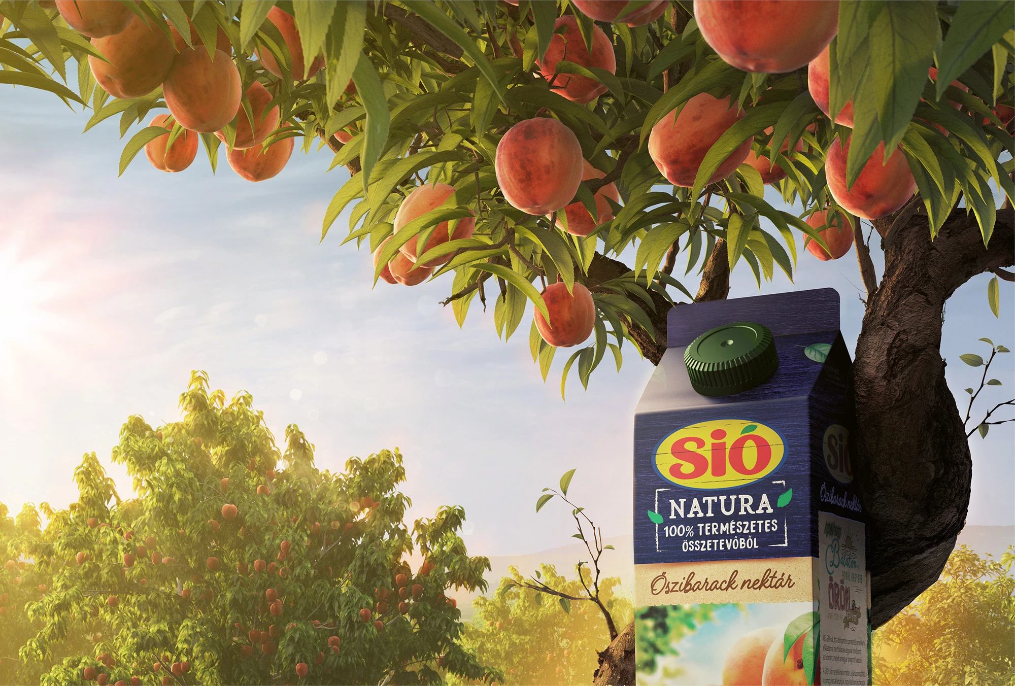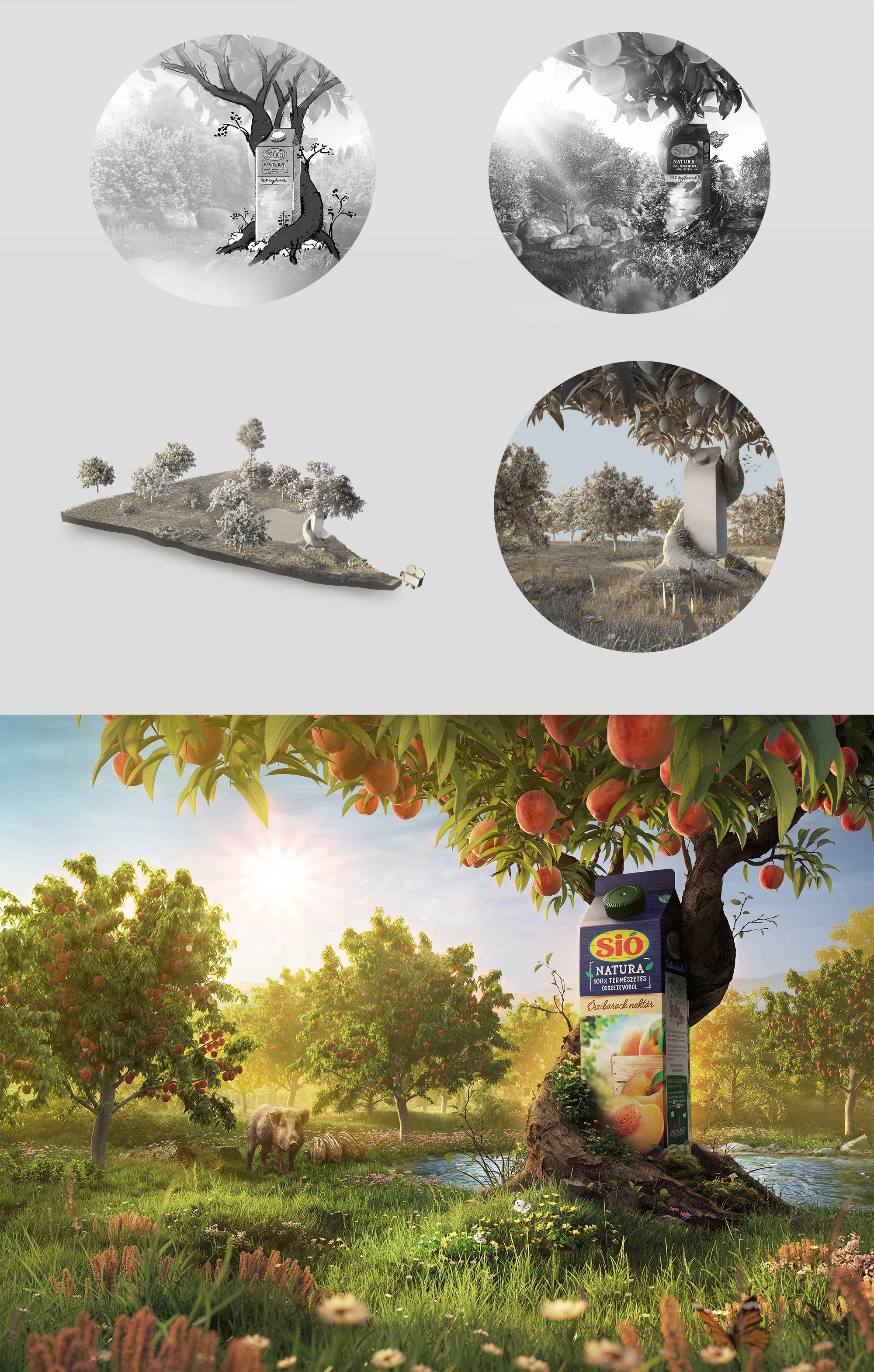 Full 3d CGI visual of nature and peach garden. A product surrounded by the tree with peaches on top.