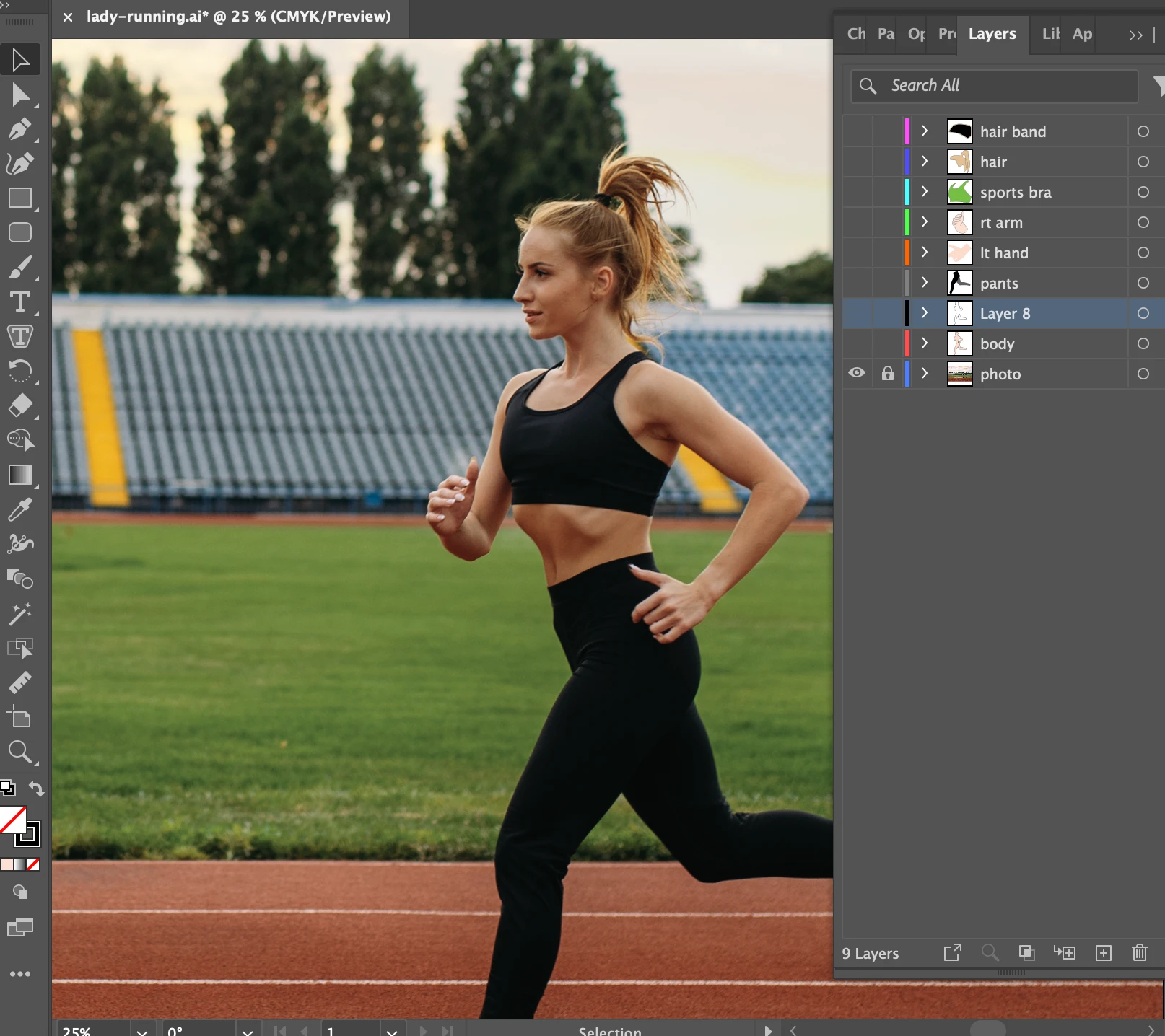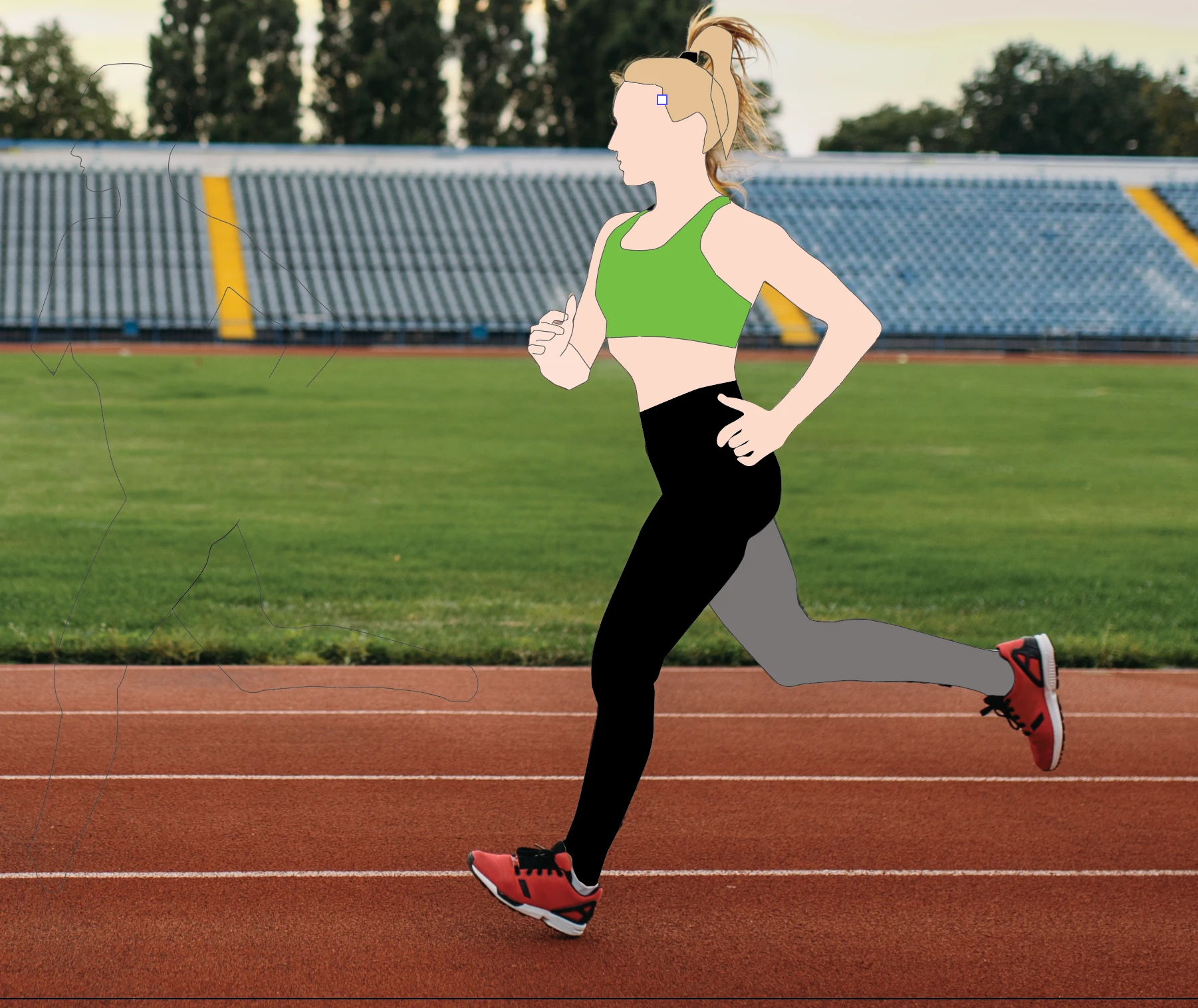 I searched for a simple photo of a woman running. Using my drawing pad, I traced the figure of the woman in Illustrator, filling in color for her clothes, hair, and shoes.
