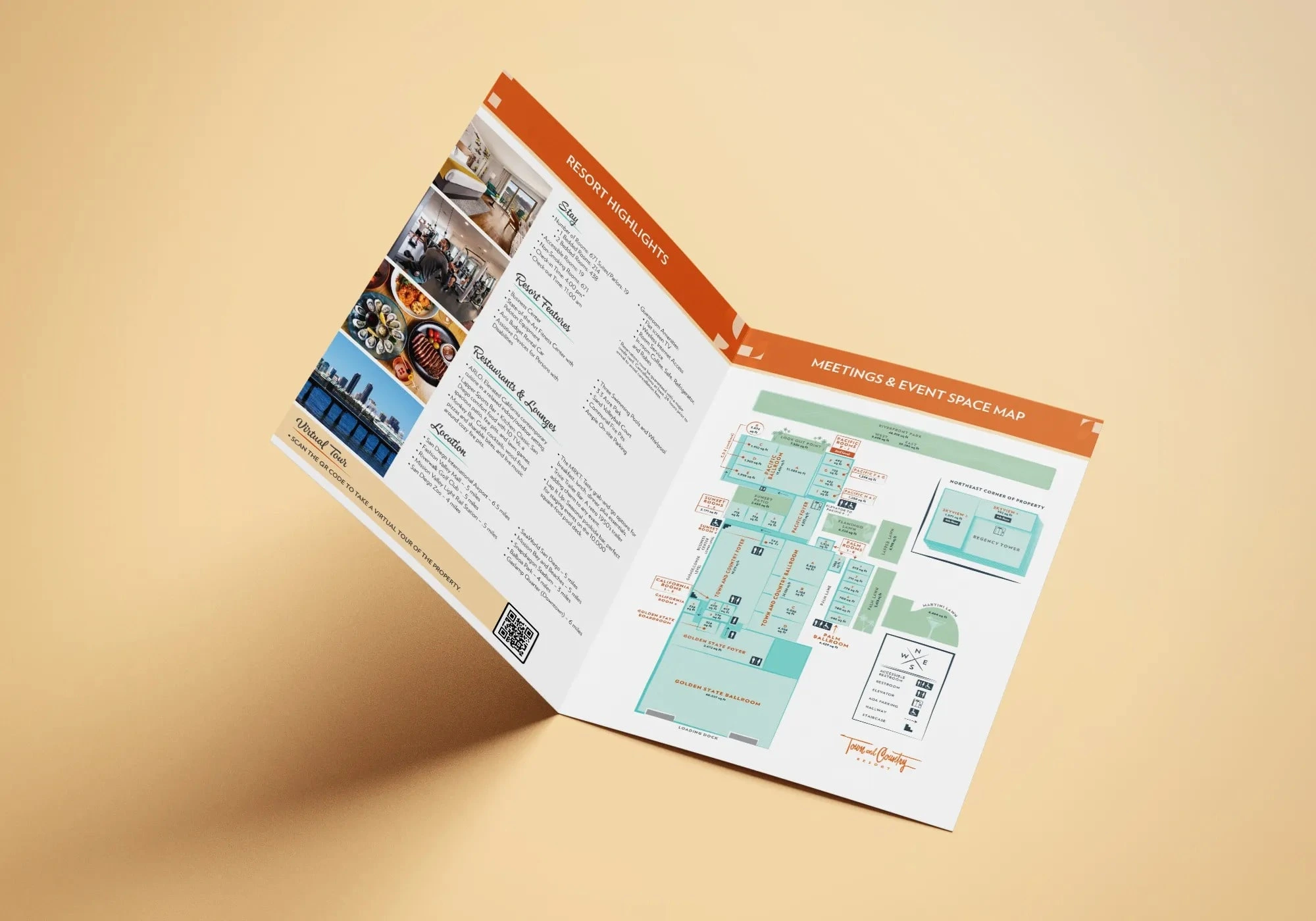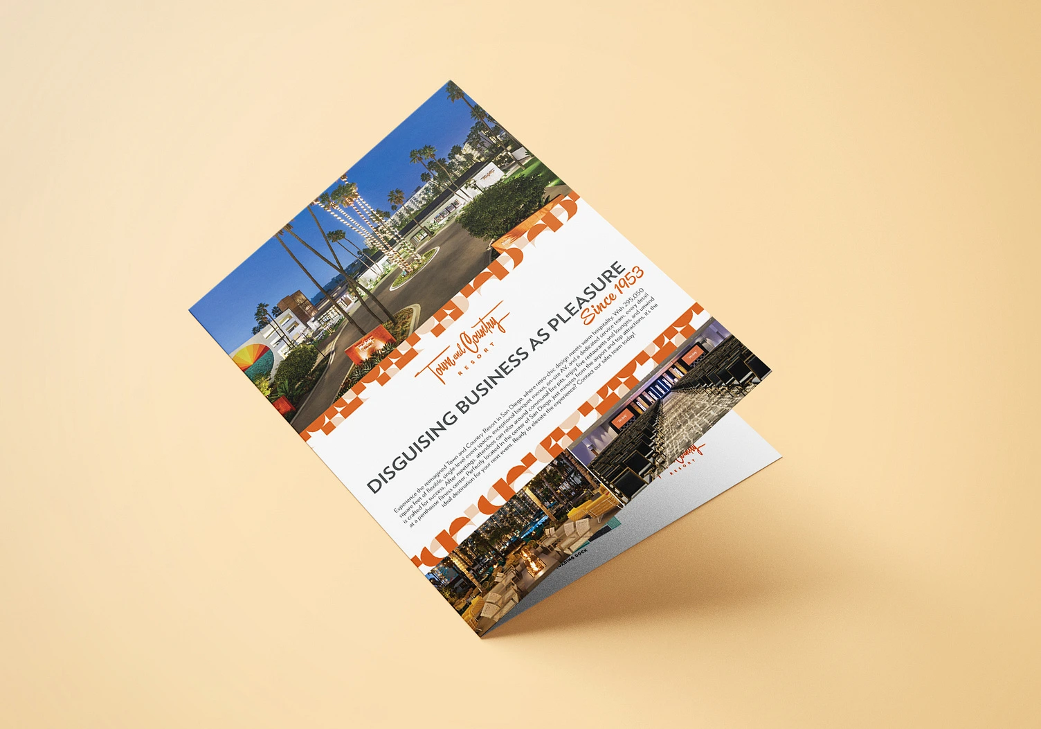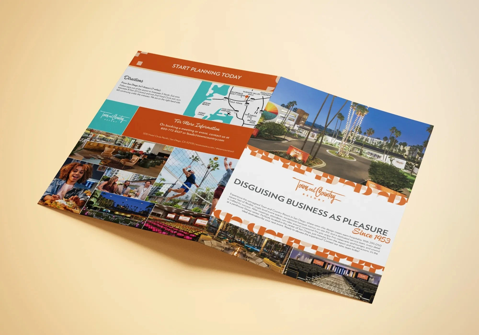 The Town and Country Resort in San Diego sought a refreshed and updated bifold sales kit to promote its convention and meeting spaces. The goal was to create a visually engaging brochure that adhered to the resort's brand guidelines while showcasing its retro-chic design, flexible meeting spaces, and exceptional hospitality. Lifestyle images were included to highlight the fun and vibrant atmosphere, while location images showcased the newly remodeled property.