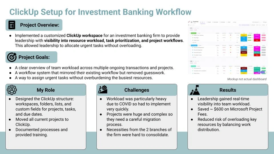 Customized ClickUp workspace for investment banking firm to improve task management and resource allocation.