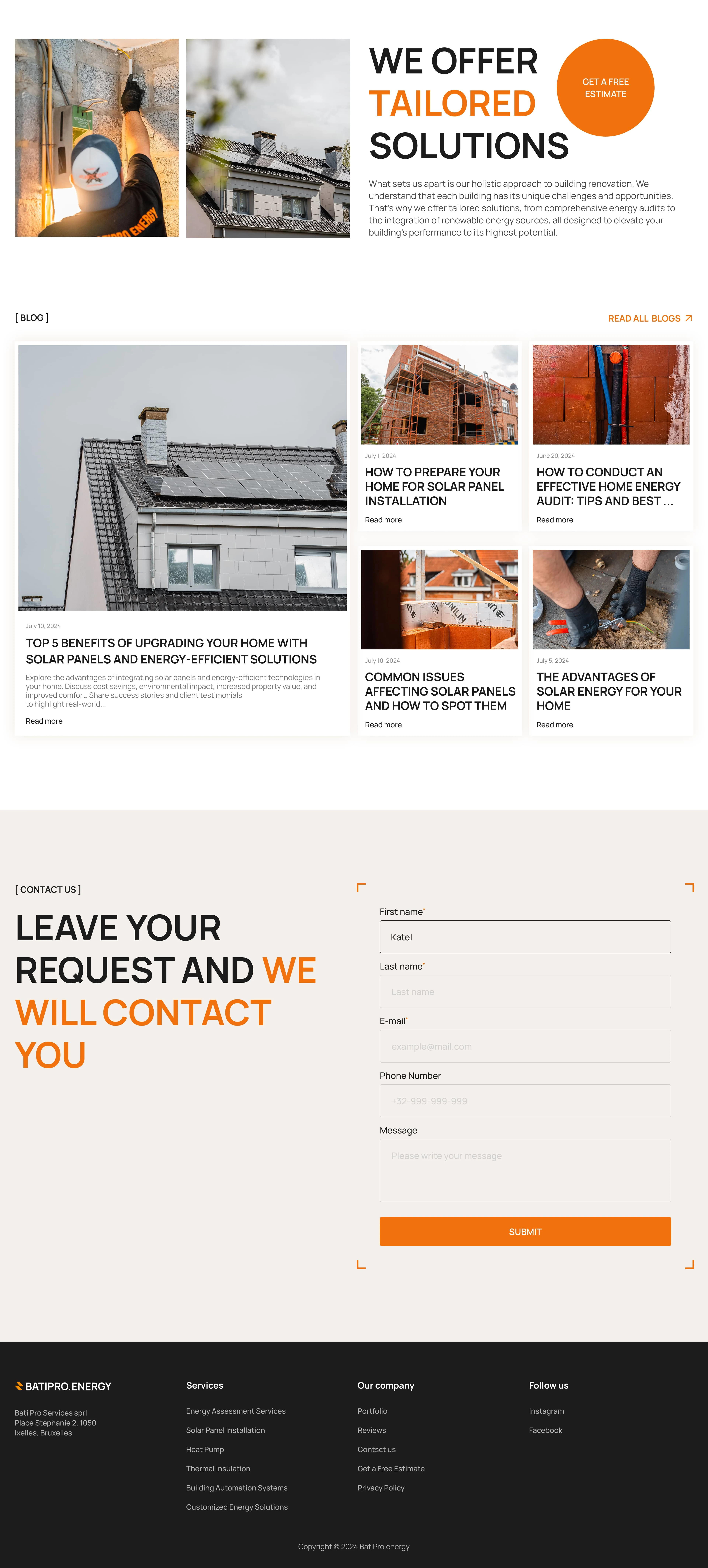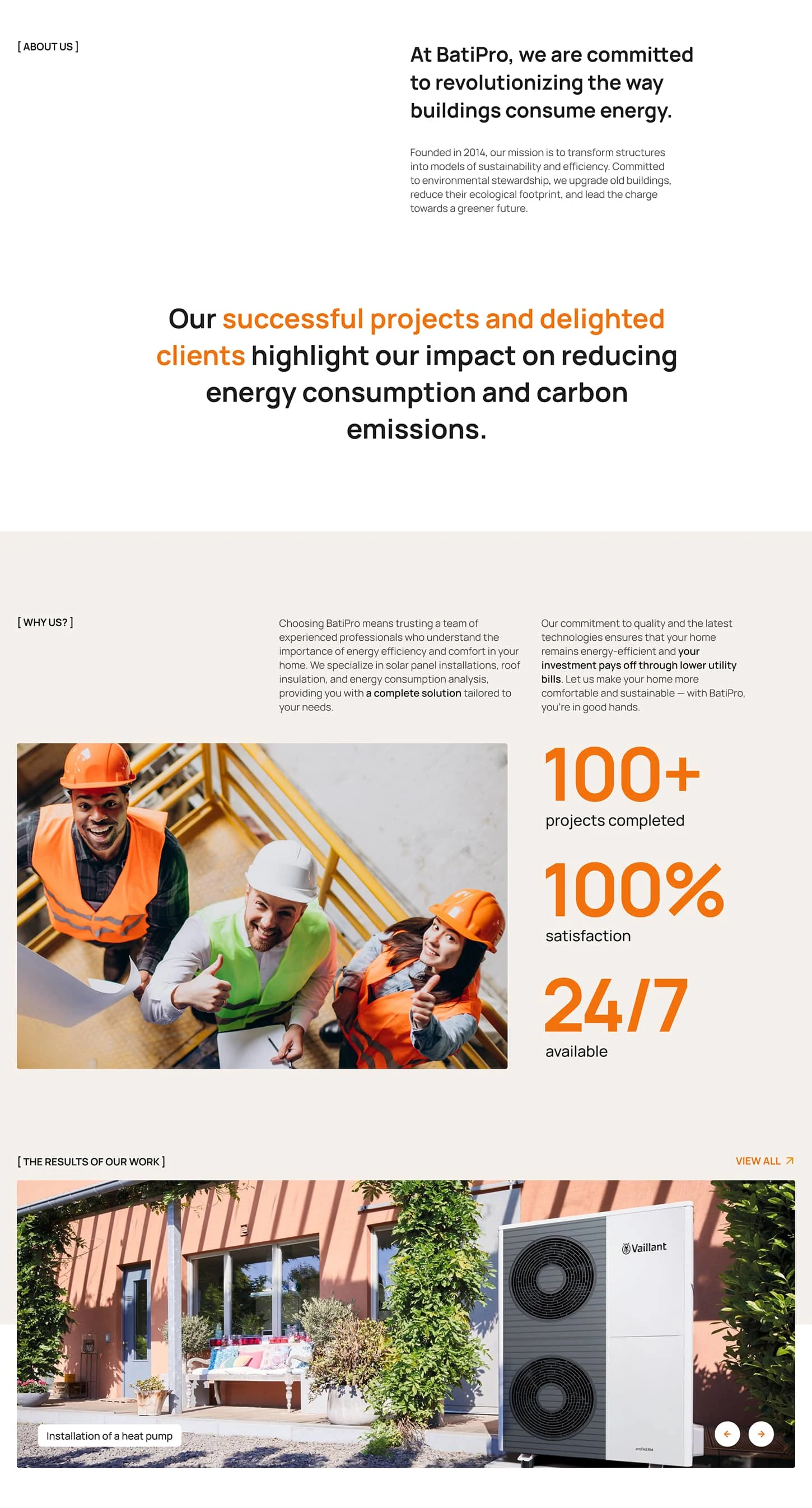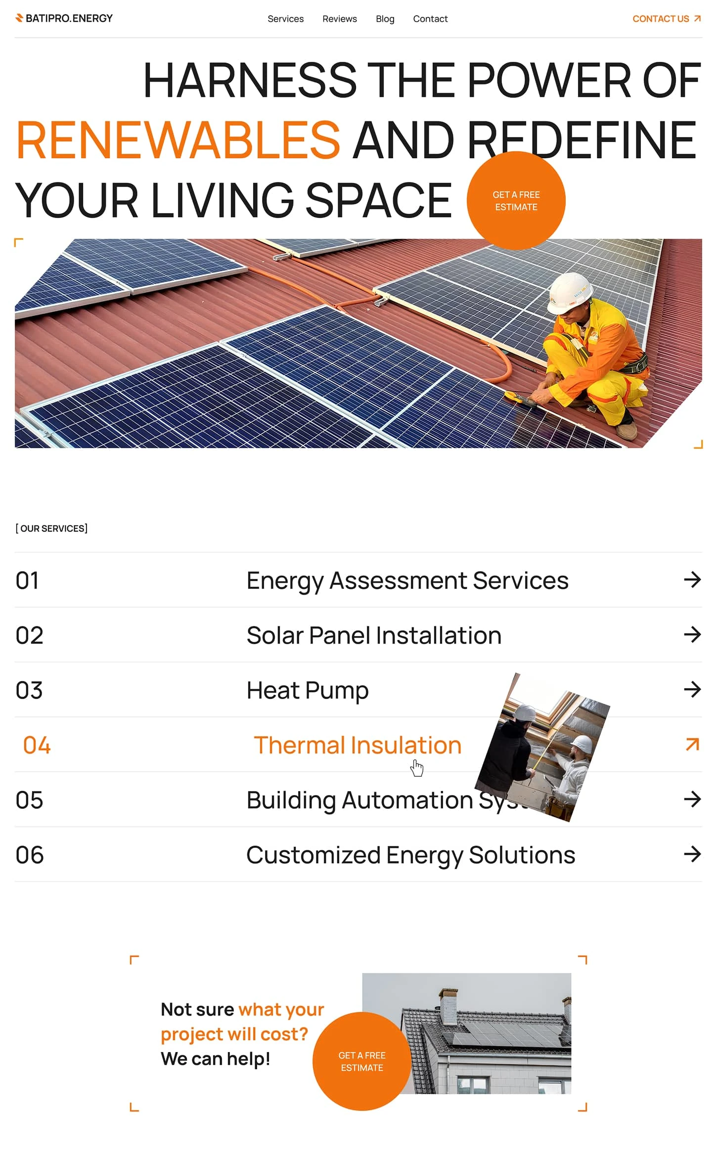 Landing page for a company that improves energy efficiency: installing solar panels, insulating roofs, and providing professional energy consumption analysis.