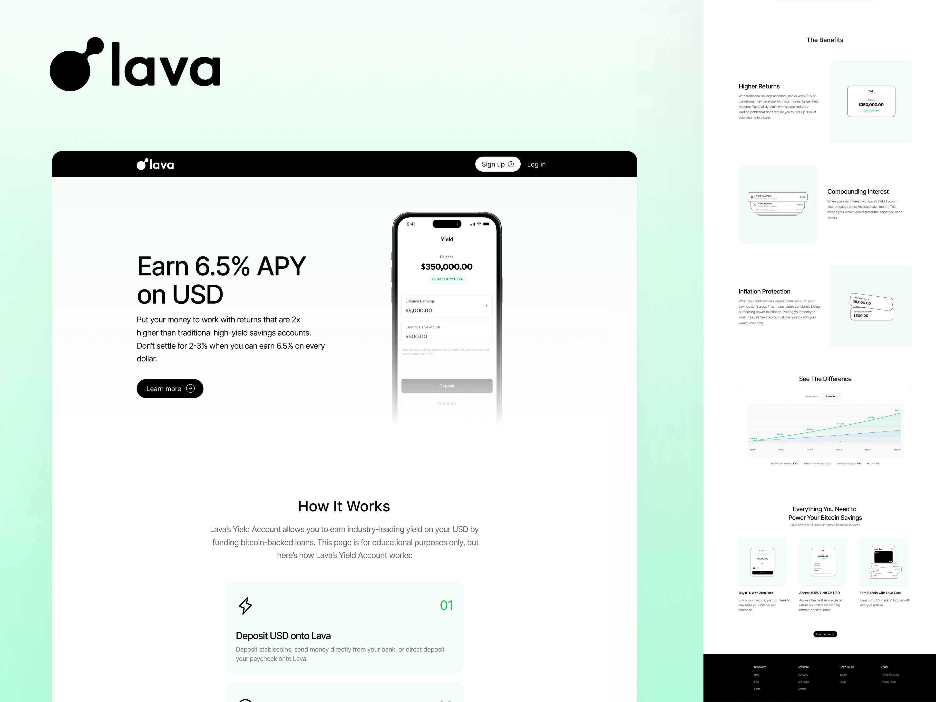 Each product received a dedicated landing page designed around a single conversion goal. The Lava Card page was structured with a card hero, three-card feature section, a BLOC comparison table highlighting competitive advantage (5% fixed vs. 9.5–15% from competitors), benefits grid, security section, and prominent bottom CTA. The Savings page featured an interactive APY comparison chart and three-step onboarding flow.