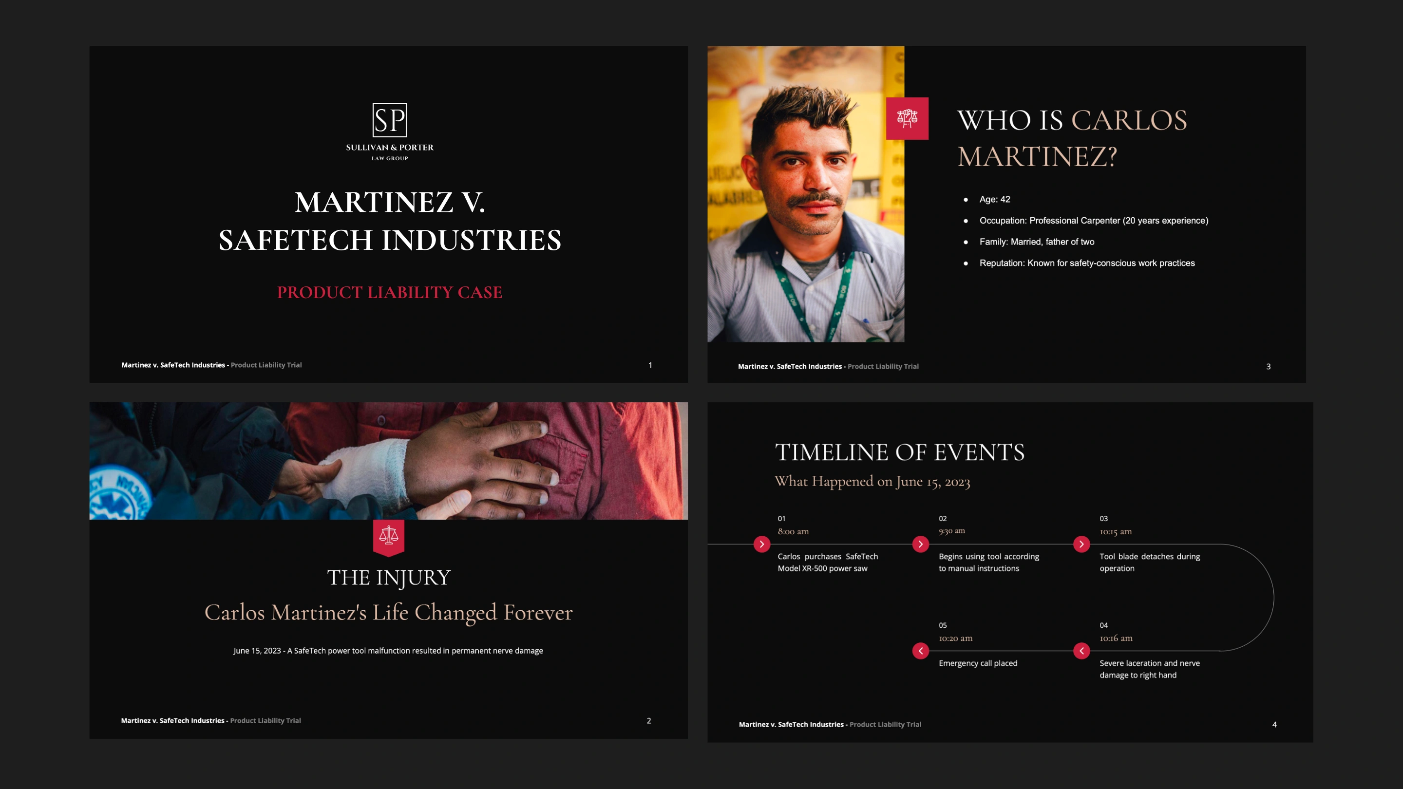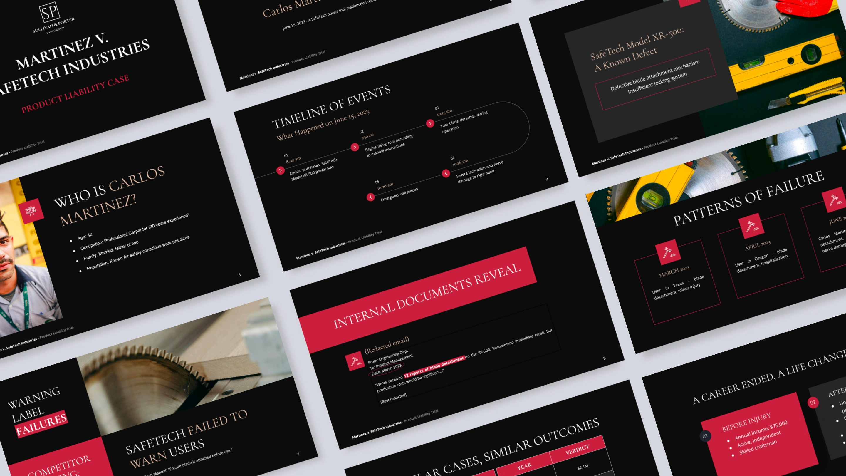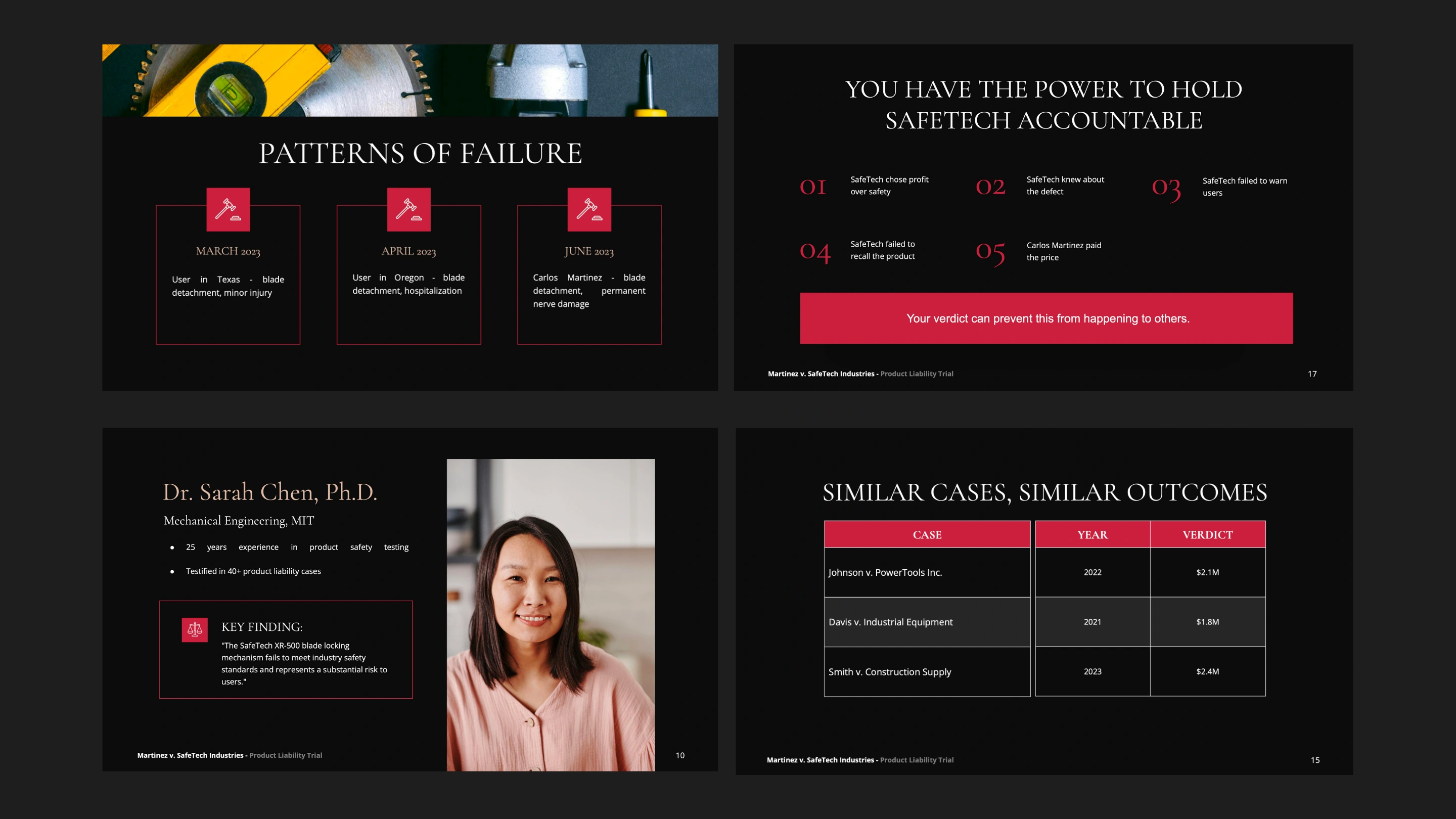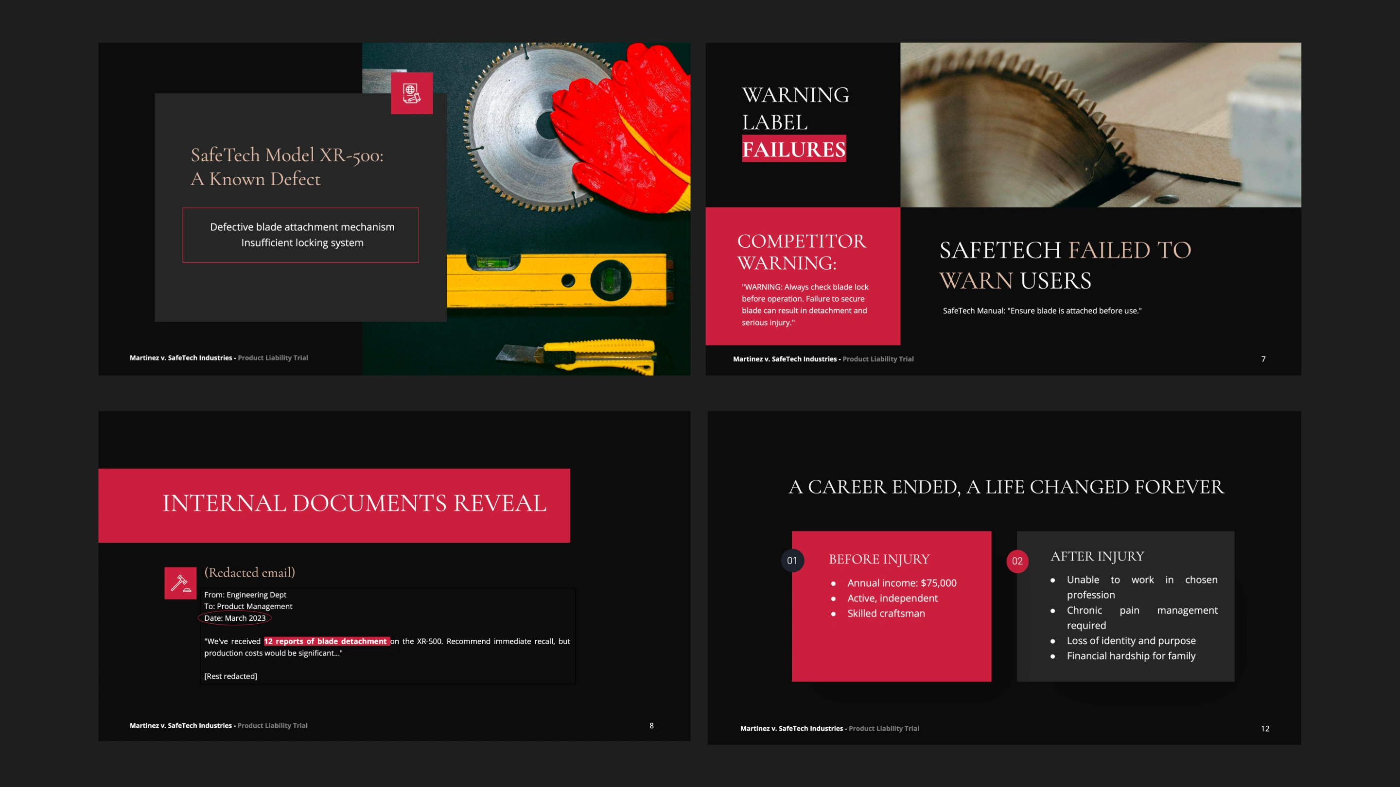 Product liability trial deck. Courtroom-optimized design transformed complex engineering defects into clear, persuasive visual narrative for jury.