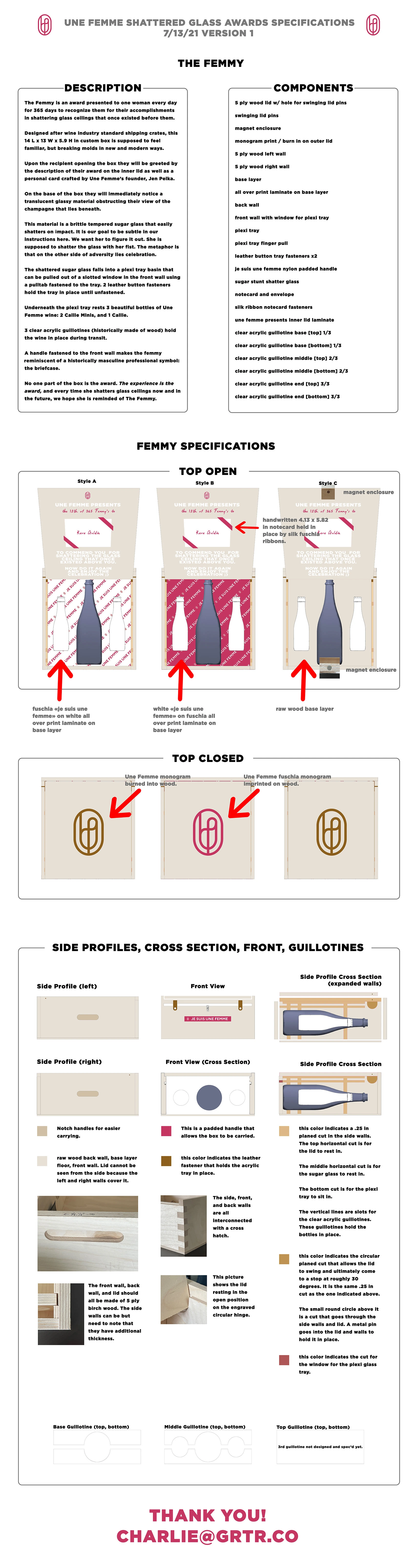 Une Femme, a women-owned and operated wine brand, wanted to do an out-of-the-box product seeding campaign. Together, we came up with an idea called "The Hall of Femme," where we would showcase a different woman every day for 365 days, highlighting their achievements in shattering glass ceilings. Each recipient received a written exposé that would be featured on Une Femme's website along with an eye-catching gift...