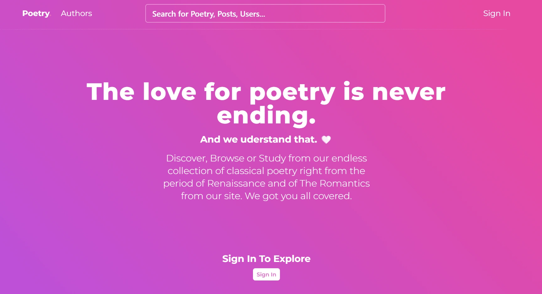 Poetry Dot is a web-app, where users can discover, browse or study from the collection of thousands of classic poetry, arranged under 130+ classical authors.