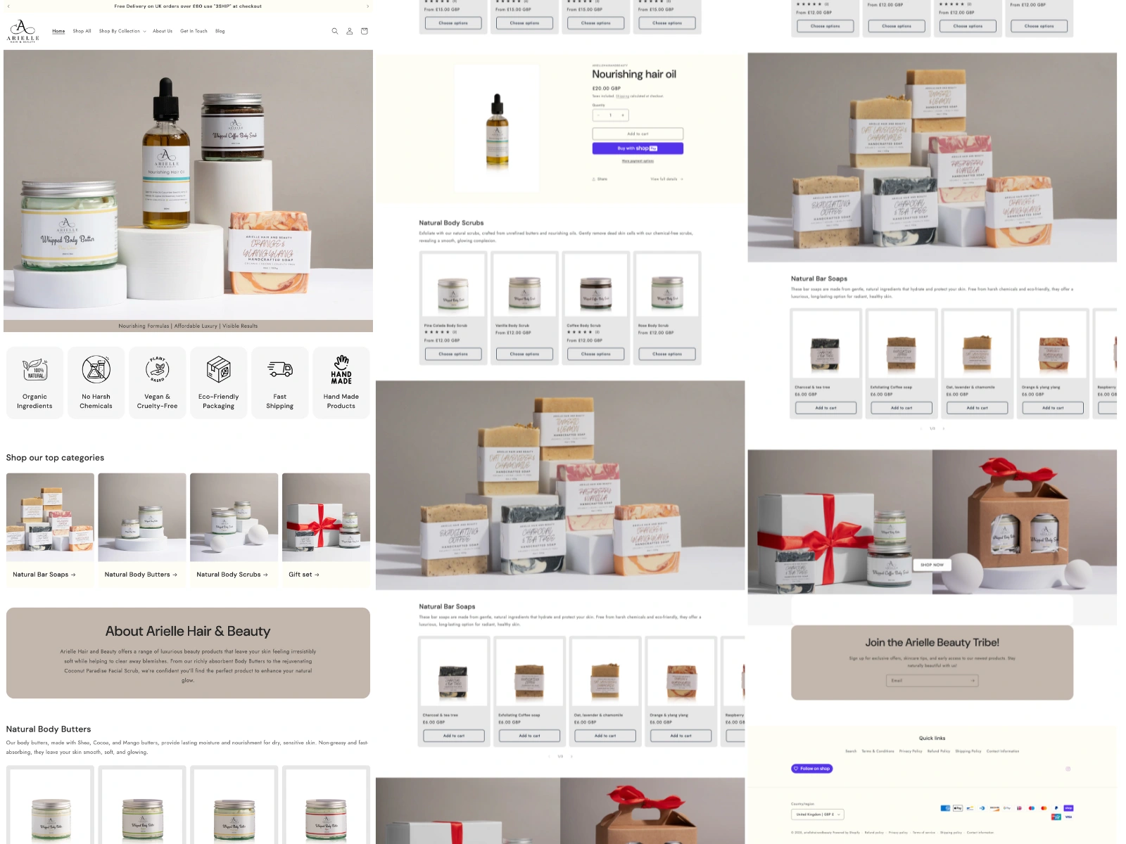Built a branded Shopify store for Arielle Hair & Beauty with multiple categories, bundle & gifting options, boosting UX, conversions, and sales potential.