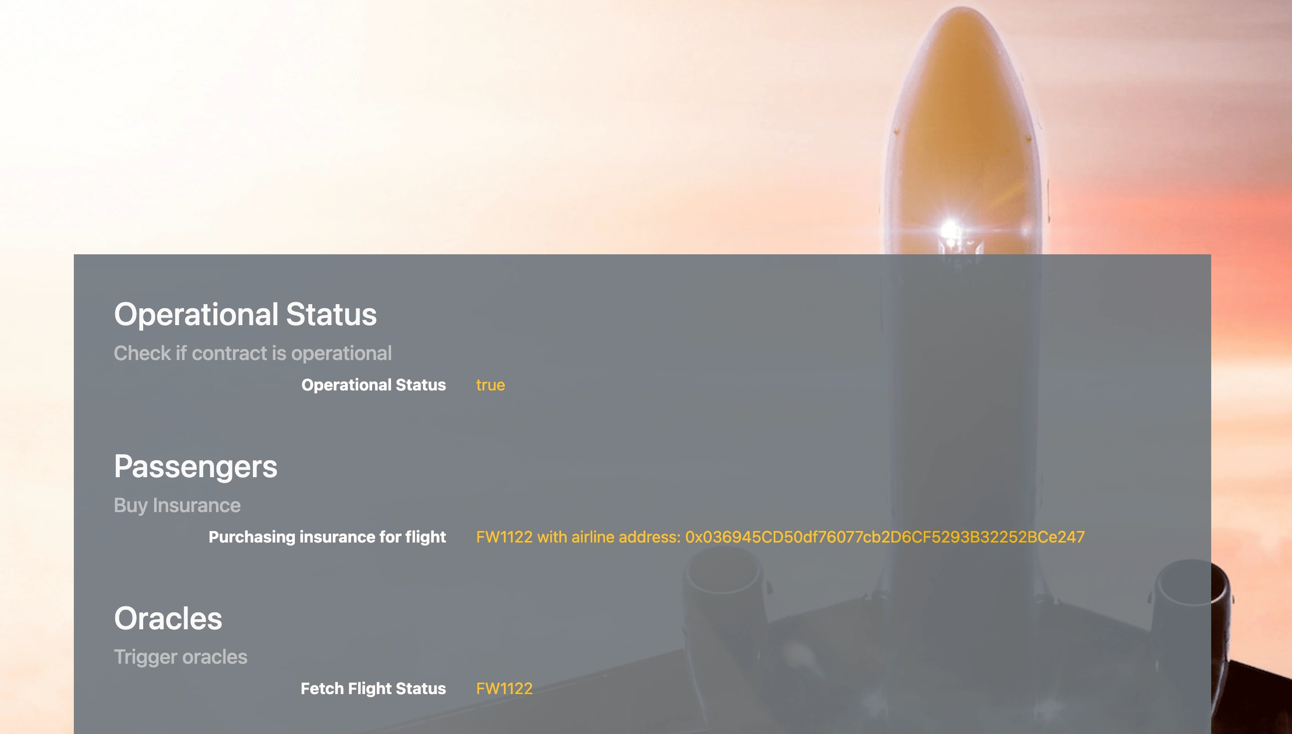 This DApp offers flight delay insurance to airline passengers. The Smart Contract uses off-chain Oracles and Airline registration require multi-party consensus.