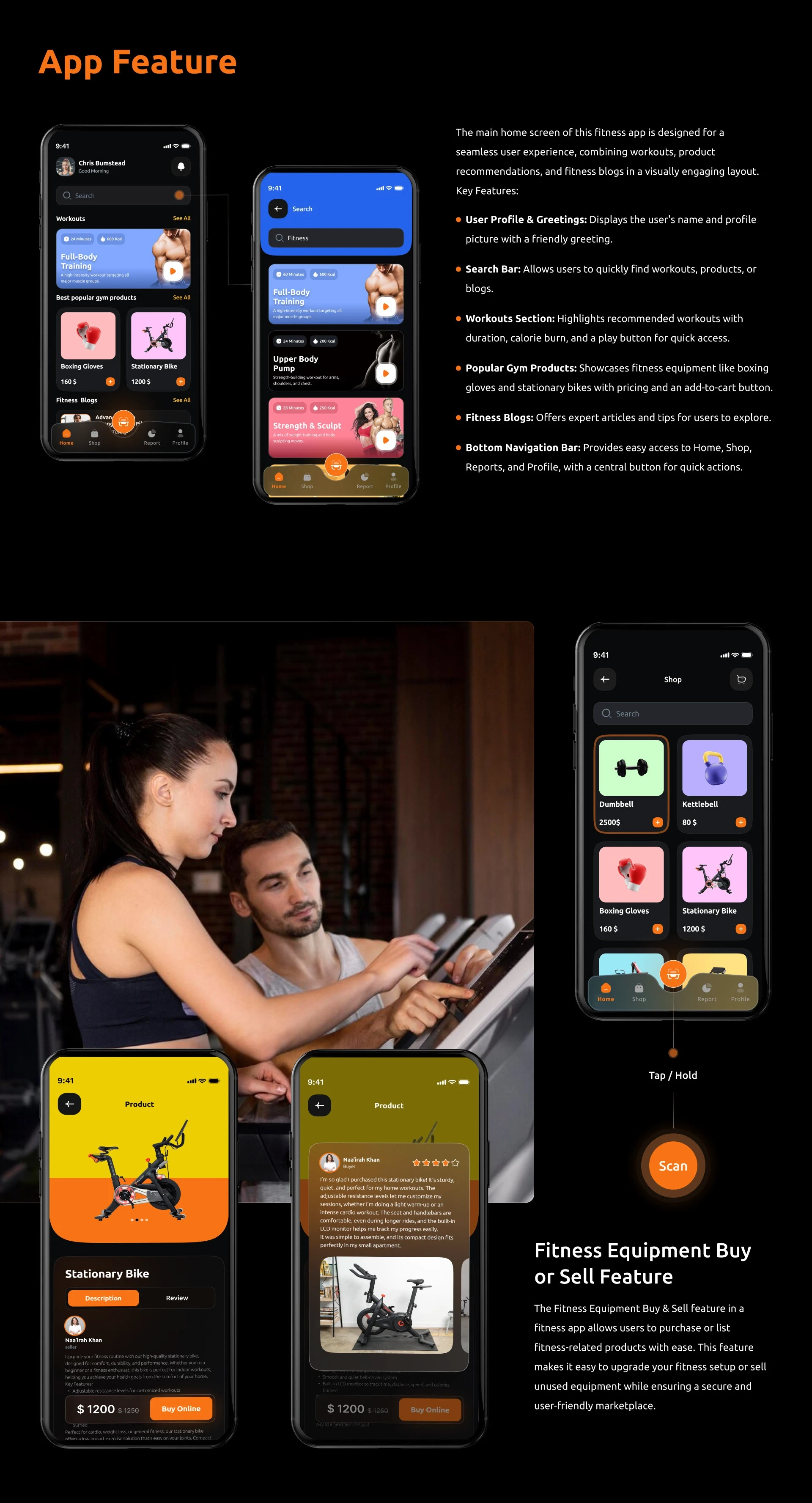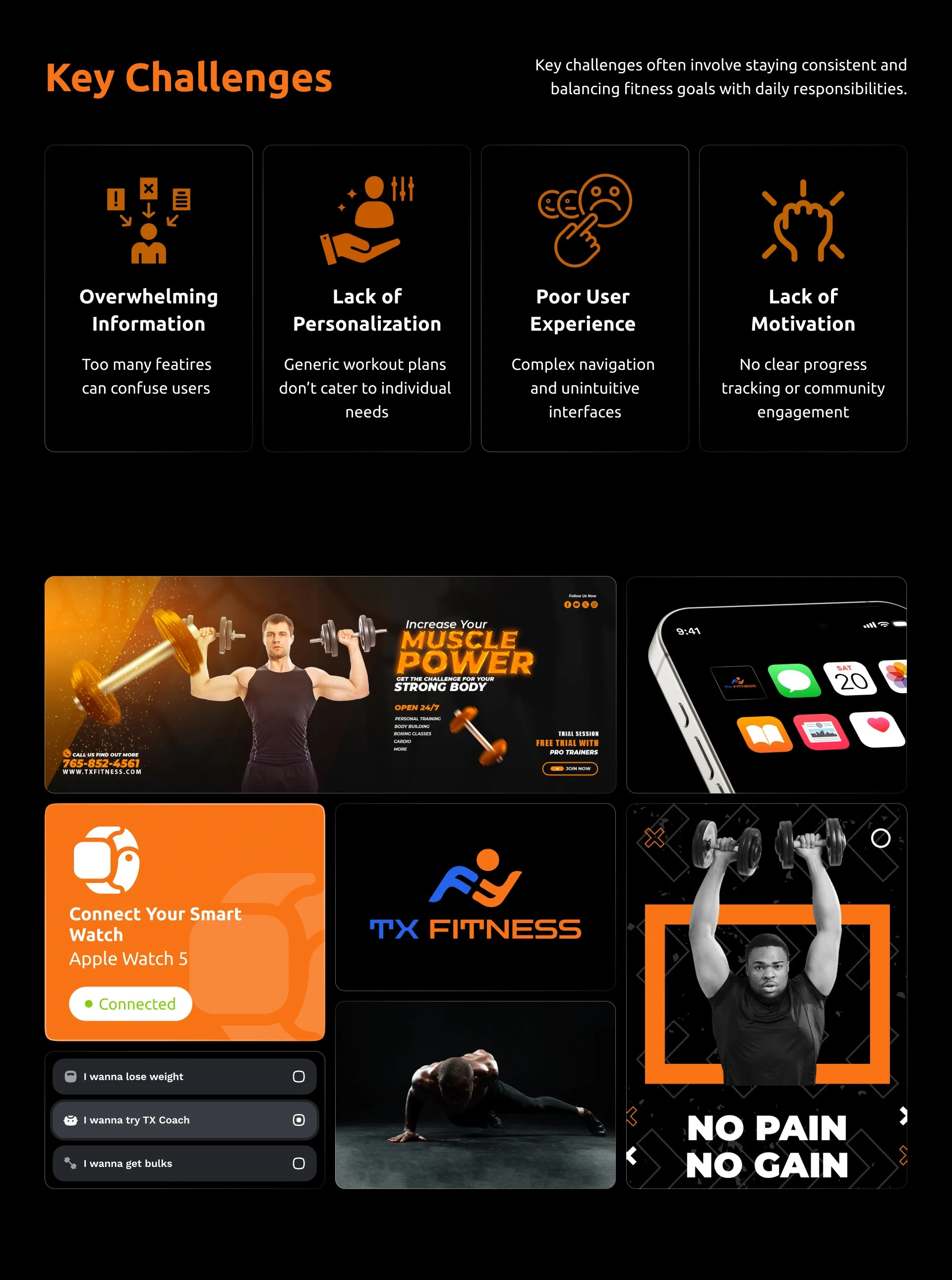 A premium dark-mode fitness mobile app UI/UX designed to help users stay consistent through workout discovery, personalization, progress tracking, and a gym equipment marketplace — all in one experience.