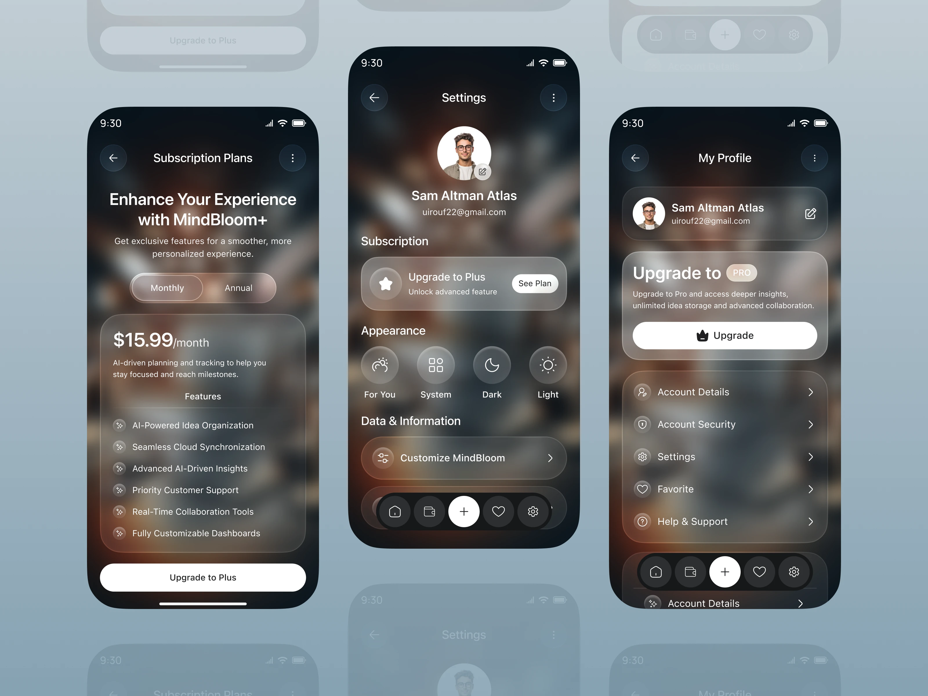 This concept showcases a modern SaaS mobile app designed to help users organize ideas, manage productivity, and access AI-powered insights through a seamless experience. The interface focuses on a premium dark theme with subtle glassmorphism, clear subscription plans, intuitive profile management, and flexible appearance settings.