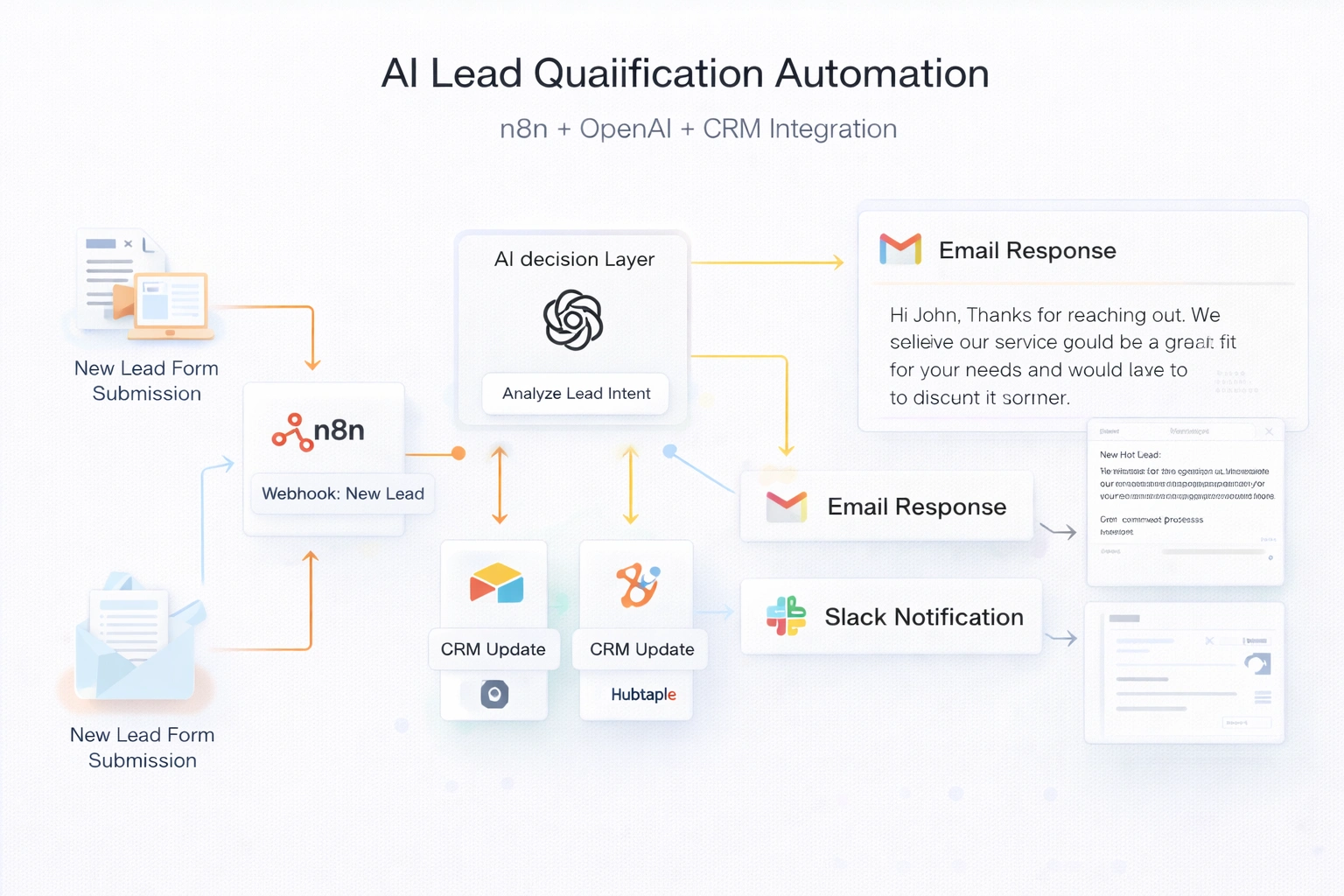 Designed and implemented an event-driven automation system using n8n, OpenAI API, and webhook triggers. Built modular workflows to ingest lead data, perform GPT-based intent classification, and dynamically score entries using conditional logic nodes. Integrated REST APIs for CRM synchronization (Airtable/HubSpot) and implemented async processing for email notifications and Slack alerts. Applied error handling, retry logic, logging, and secure API key management to ensure reliability and scalability.