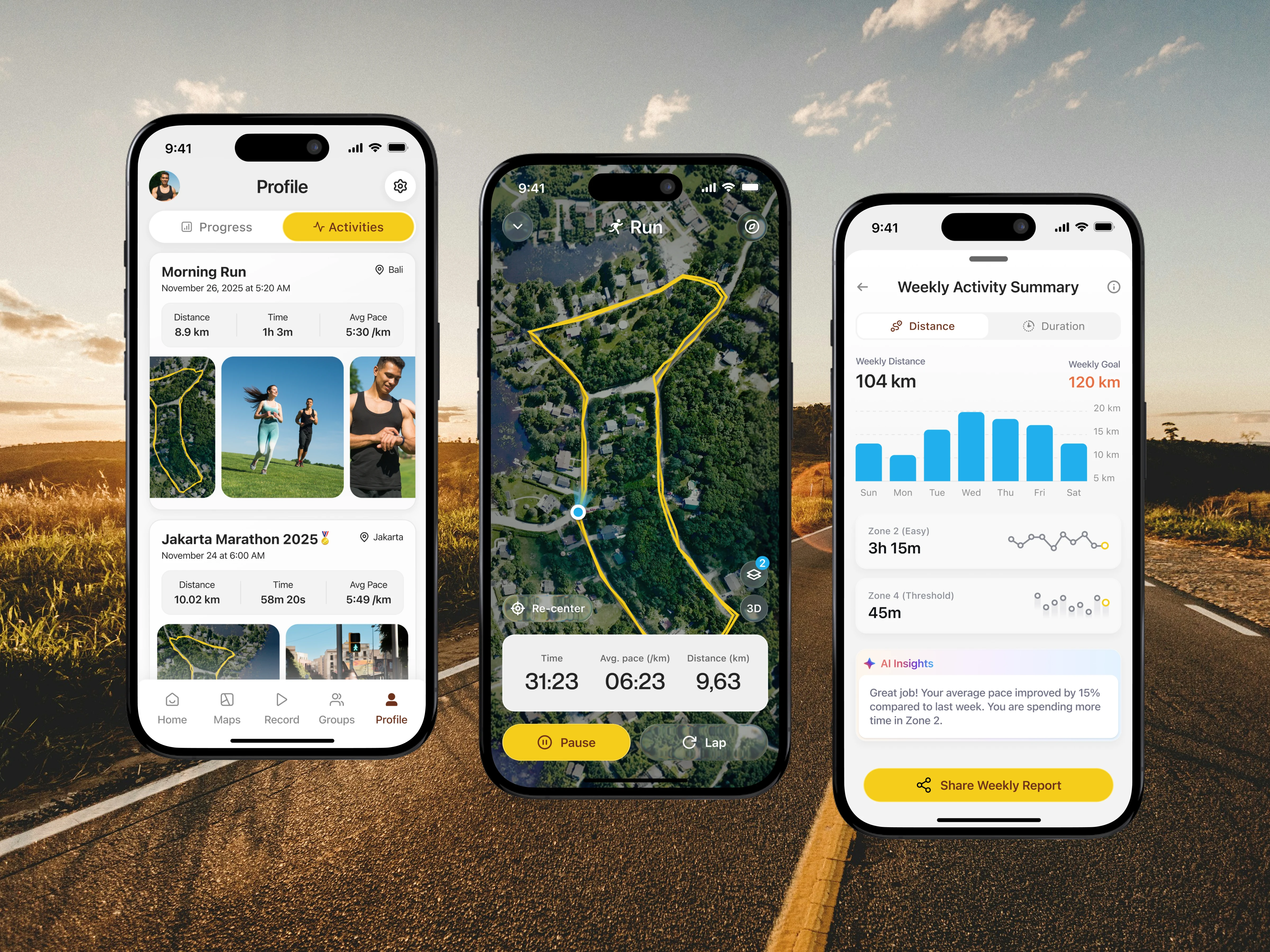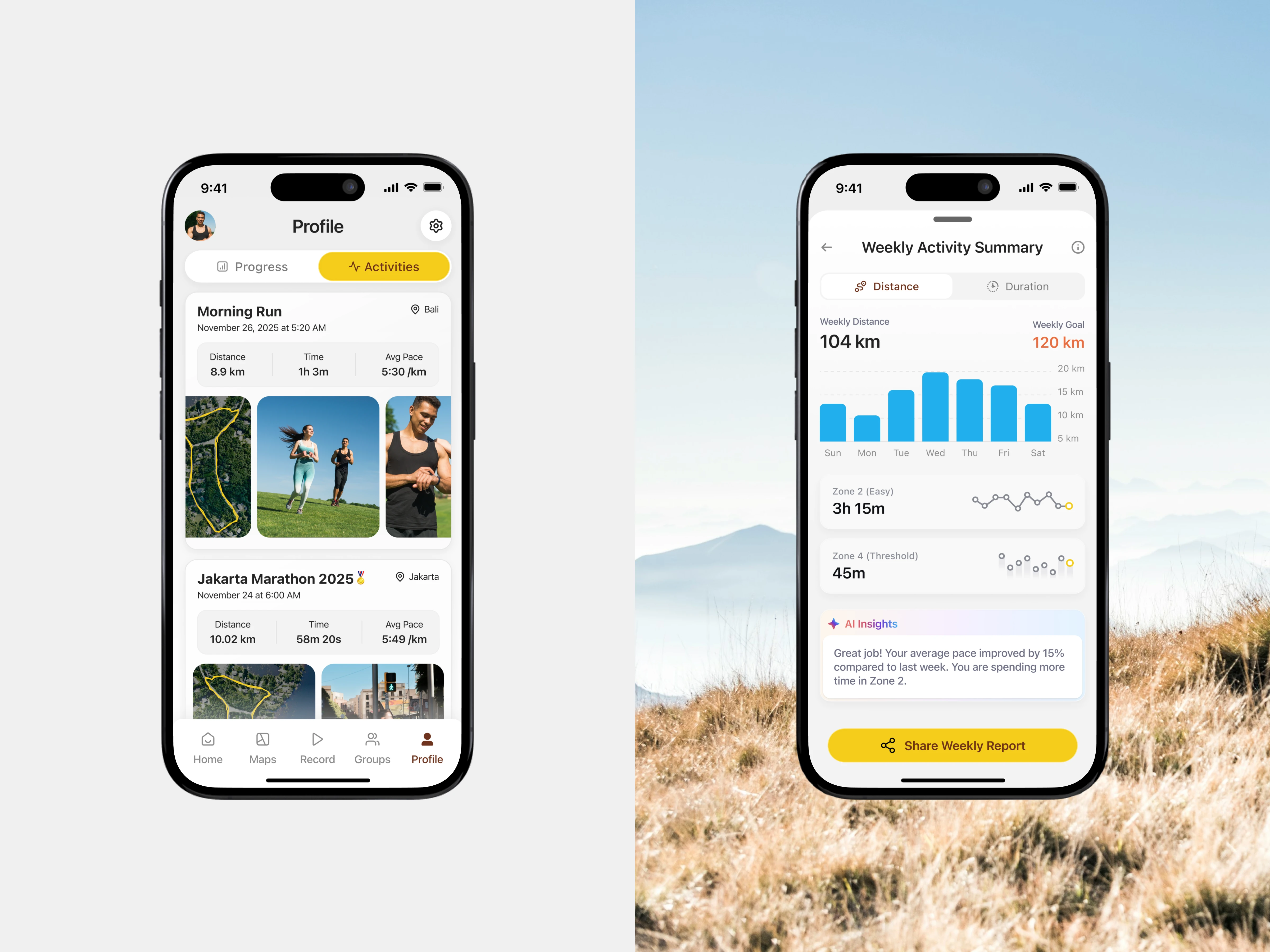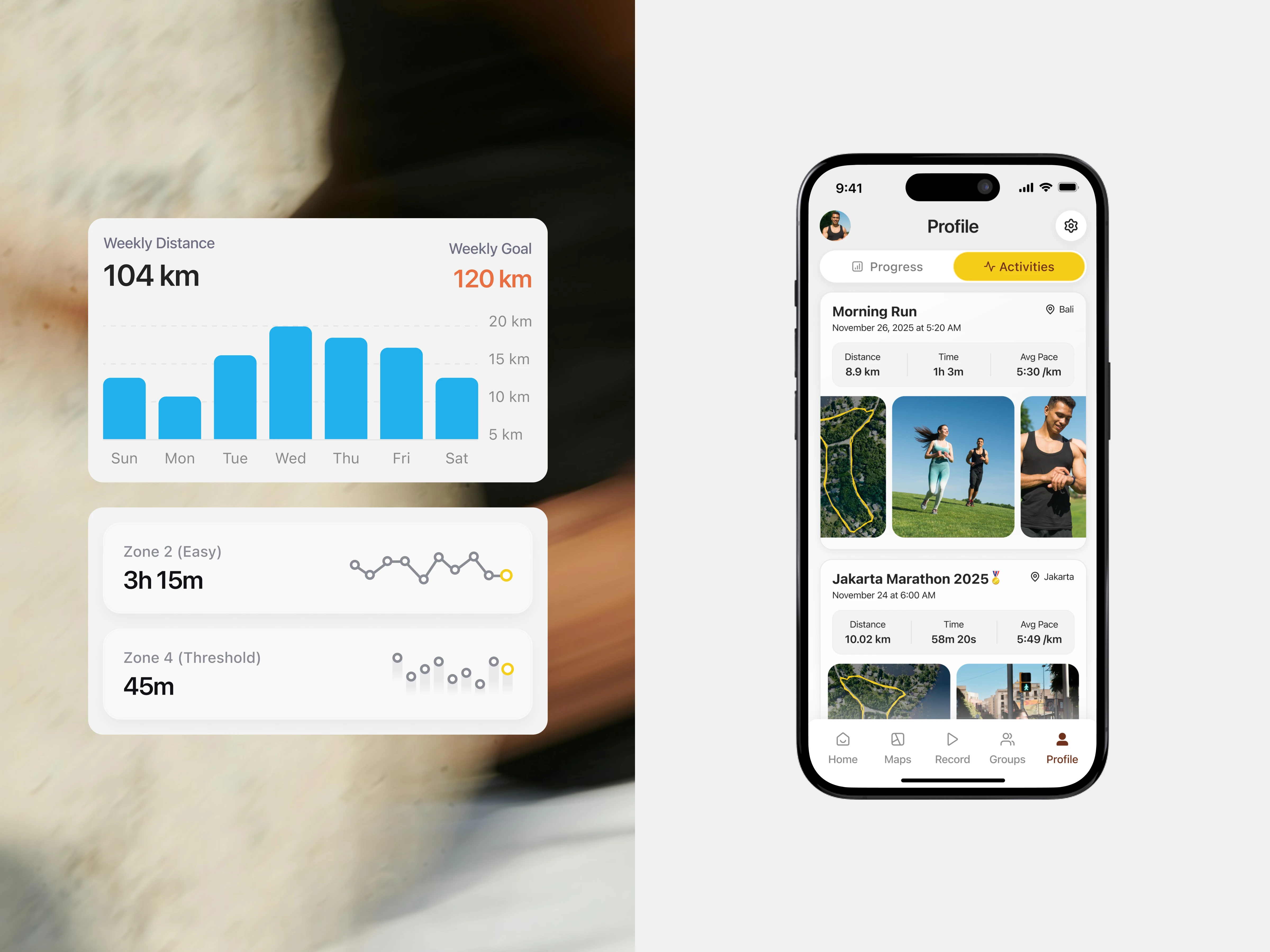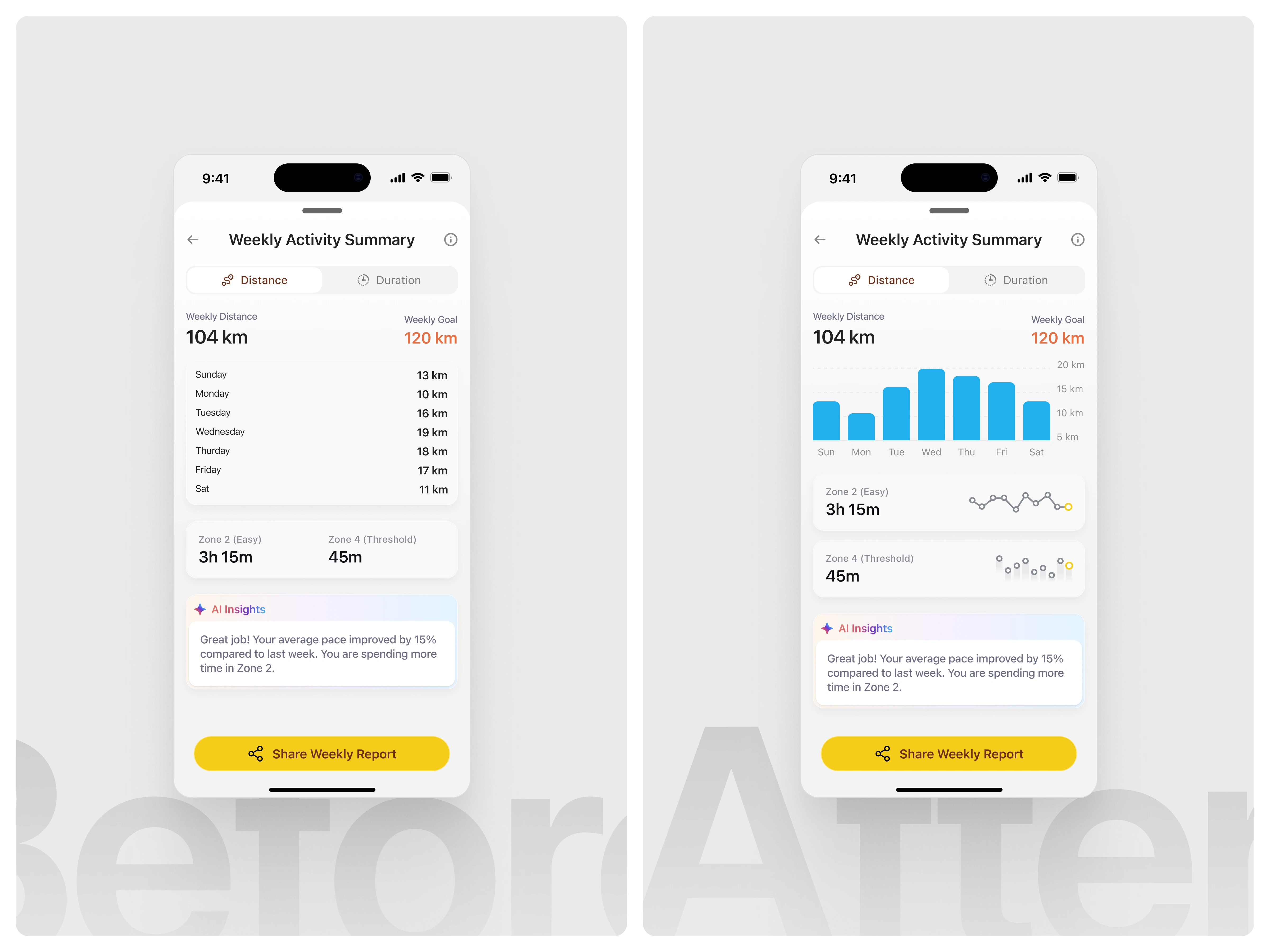 In the improved version, the daily distance data is visualized using a bar chart, allowing users to instantly recognize patterns, peaks, and gaps across the week. Visual hierarchy helps users quickly grasp performance distribution without reading each value individually. Supporting metrics, such as training zones, are also enhanced with lightweight visual indicators, reinforcing comprehension at a glance. These changes reduce cognitive load and make weekly insights easier to understand, faster to scan, and more engaging, especially in a performance-tracking context. (src: Jakob Nielsen – 10 Usability Heuristics for User Interface Design)