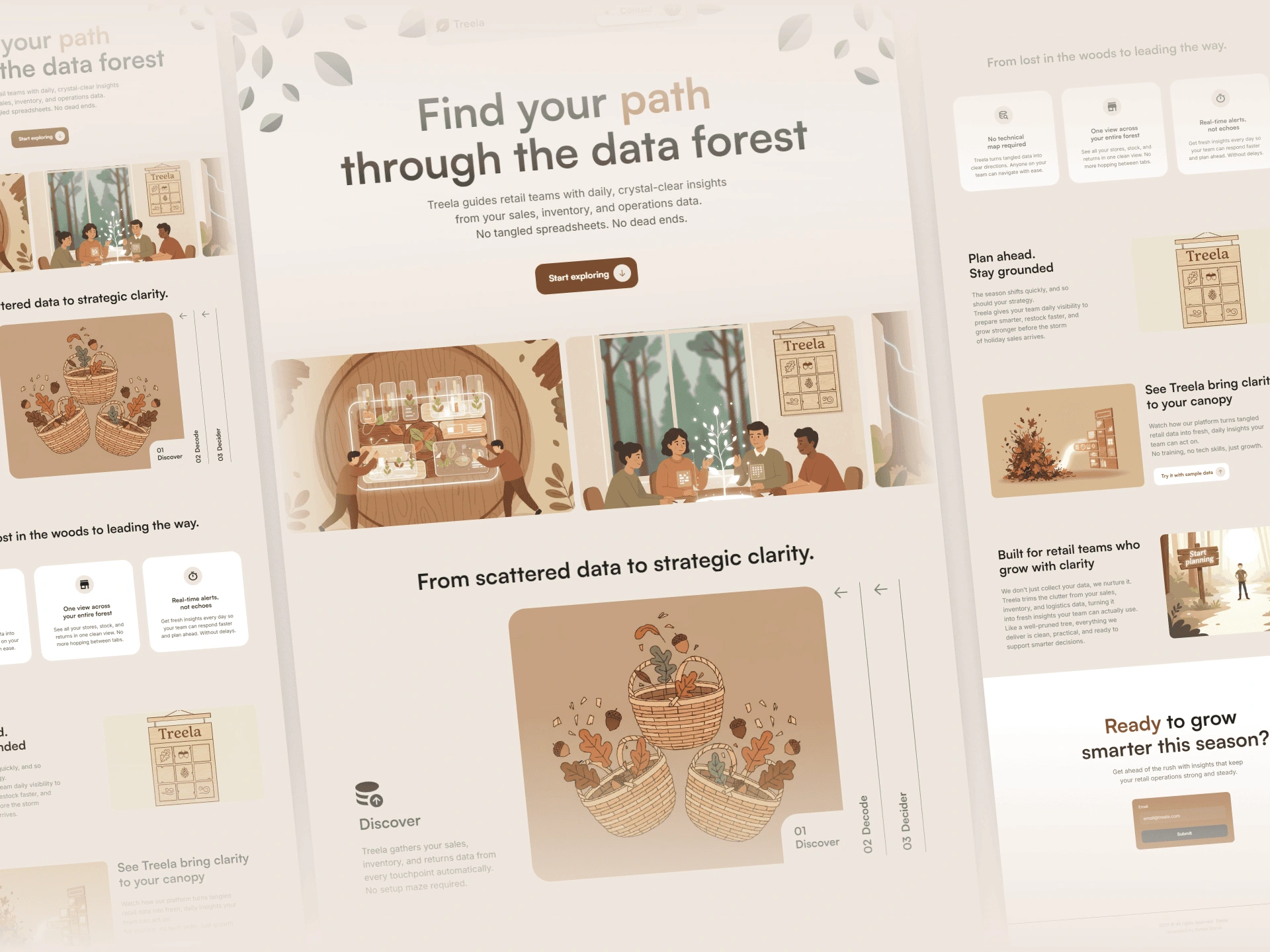 Treela is an intuitive data platform built to help retail teams turn complexity into clarity, supported by a responsive landing page designed in Figma and Framer. The interface applies strong visual hierarchy, branded components and AI-enhanced flows to organize scattered sales, inventory and logistics data. Soft tones, rounded elements and subtle microinteractions create a modern, approachable experience that turns fragmented information into actionable daily insights.
