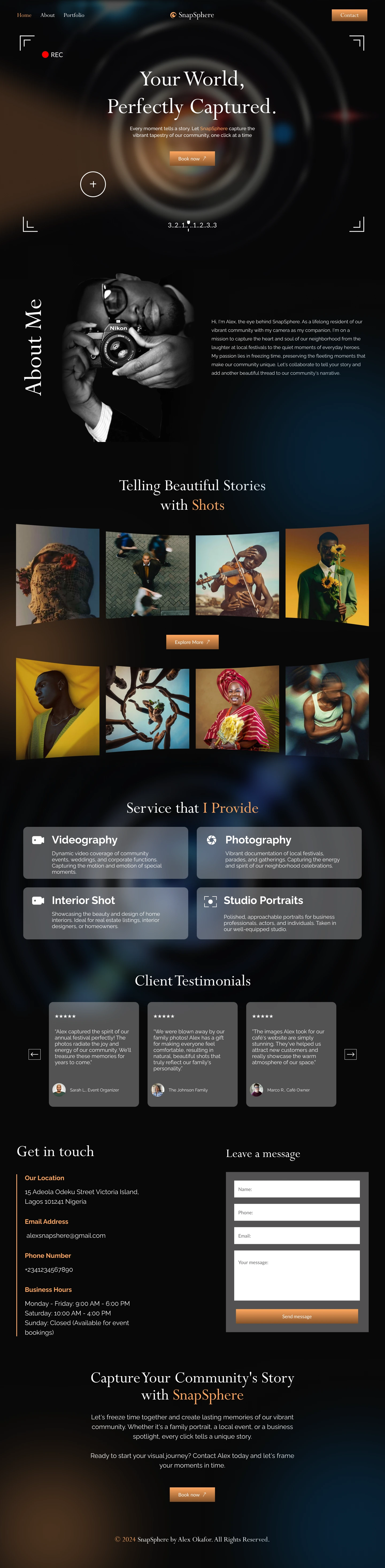 I used dark-themed, elegant visuals to emphasize the photography work, paired with warm accent colors for contrast. The layout was structured for high visual impact, showcasing hero imagery, an “About Me” section, service highlights, client testimonials, and a contact form for easy inquiries.