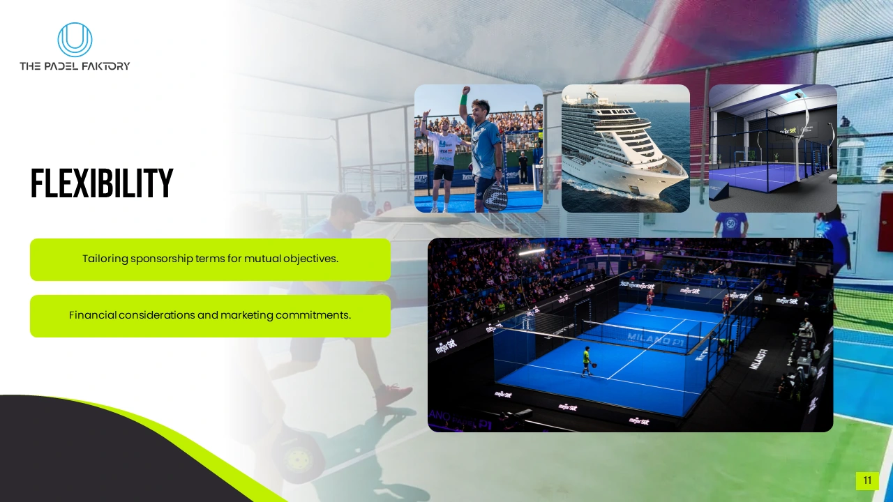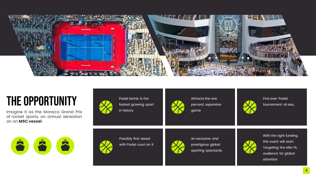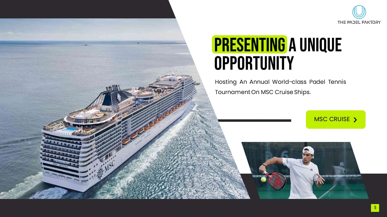 Through compelling storytelling, modern presentation design, and structured content, the deck showcased the tournament format, onboard fan engagement, entertainment programming, and sponsorship opportunities. It emphasized the brand’s ability to execute large-scale, innovative events while positioning the cruise-based padel tournament as a globally appealing concept for athletes, audiences, and partners seeking unforgettable sports and entertainment experiences