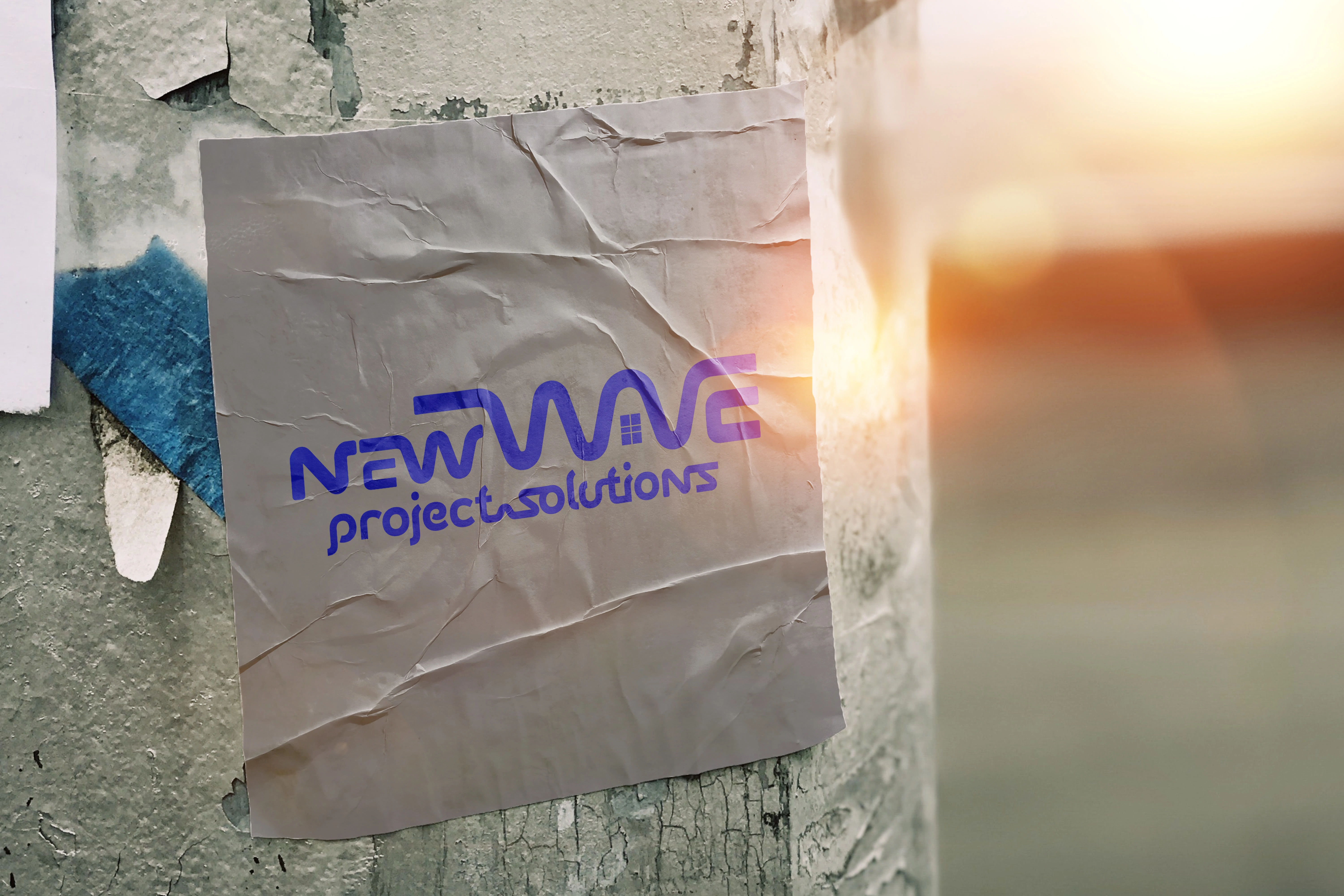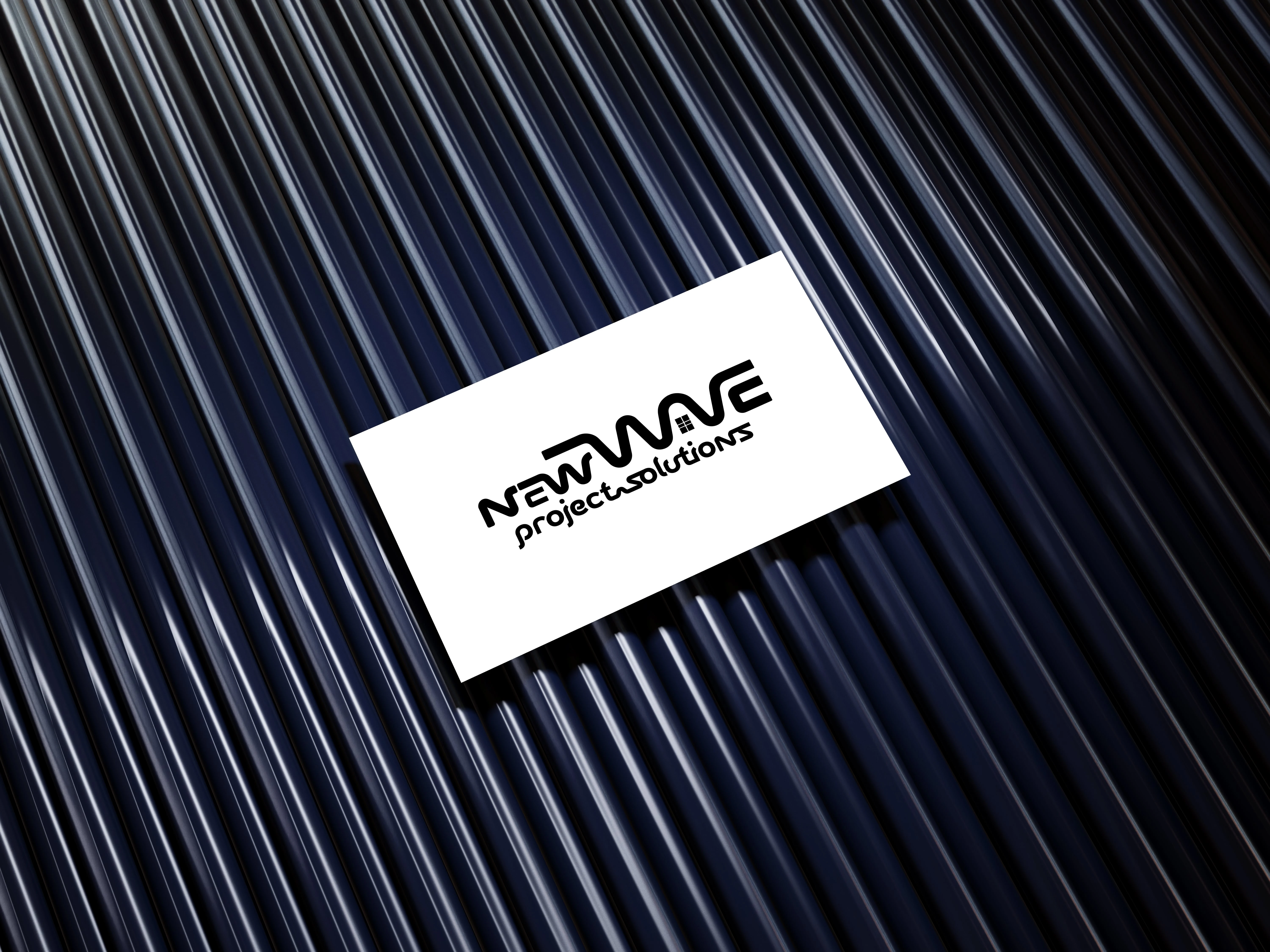Logo:"NEWWAVE" in custom geometric sans with integrated roof-plate icon (subtle steel I-beam forming the "W"). Variants: Horizontal lockup, Icon-only (roof plate), Stacked for facades.