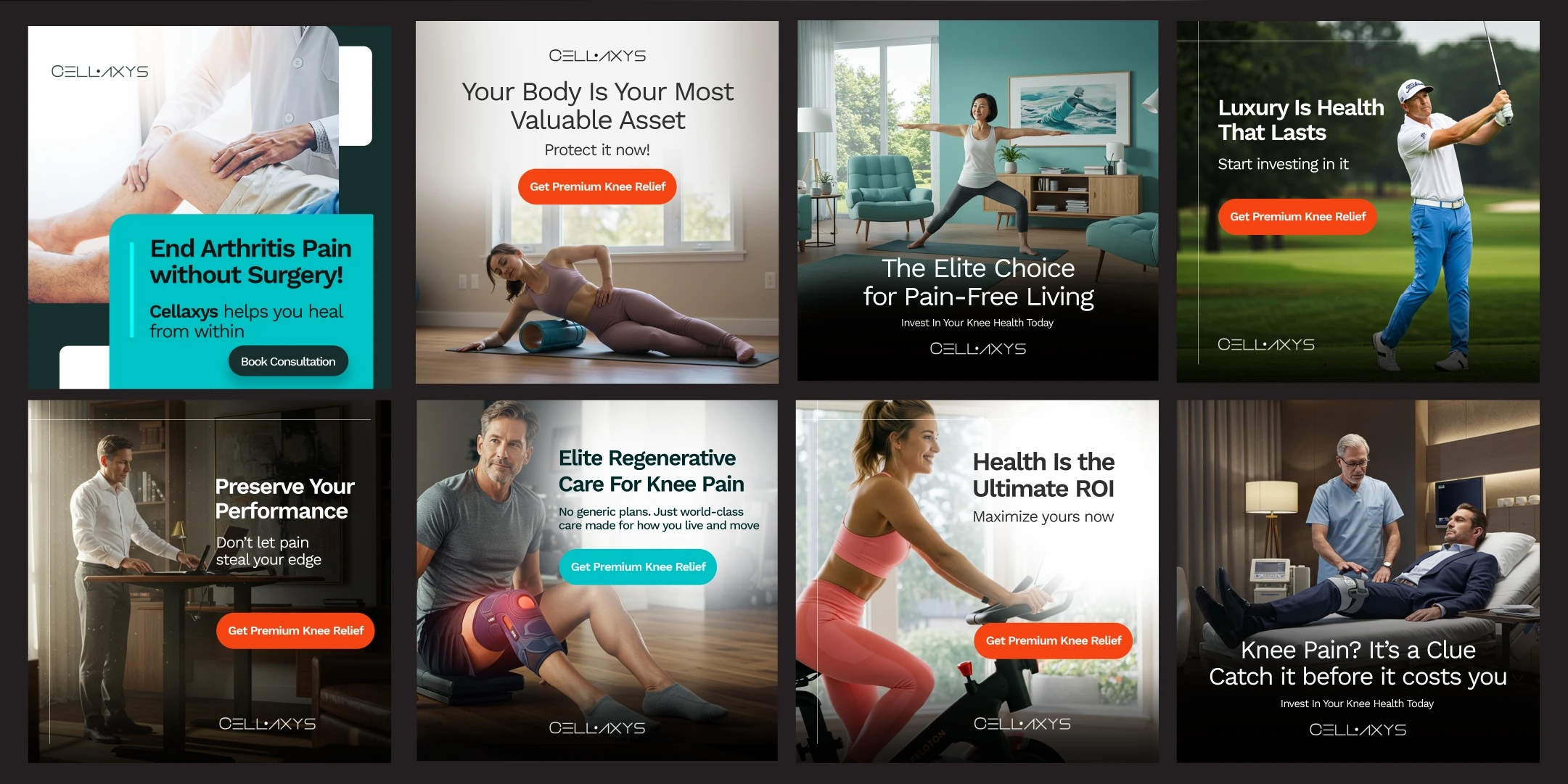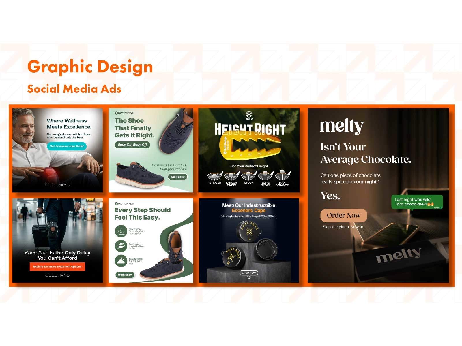 For past clients, I created static ads across niches like wellness, fashion, consumer products, and tech. Each creative was tailored to the brand’s identity and campaign objectives—whether driving traffic, generating leads, or boosting e-commerce sales. I focus on clear messaging, scroll-stopping visuals, and strong CTAs that speak directly to the target audience.