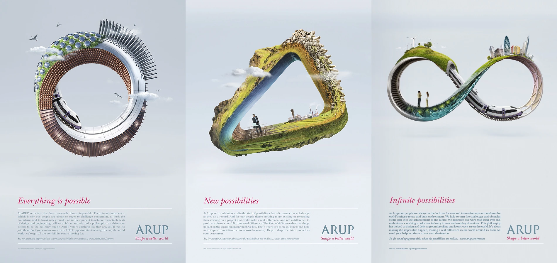 I was asked to produce impossible objects for ARUP ad campaign. We used a combination of CGI, 3d and photography retouching to achieve desired effect.