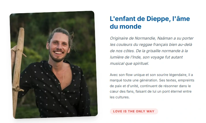 Today, Naâman would have turned 36. His music, a fusion of reggae, hip‑hop, and both classic and modern sounds, has inspired countless people around the world. His lyrics touched on themes such as life, love, and social issues. Beyond all this, Naâman inspired me with his global vision, performing everywhere from France to Jamaica, and from Mozambique to Goa. It was in these last two places that his final studio album, Temple Road, drew much of its inspiration, with songs like Maputo and Sunrise of India. However, it’s in his classic songs like Simplicity that I highlight this verse: “A free ride is a good ride / Starting it from nowhere it ah end up worldwide”, or in Crazy, with his vision: “Well the real friend is our wisdom” and “Well a simple life is the keystone.”