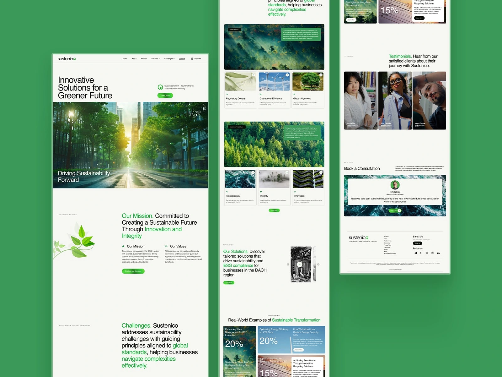 Sustenico is a Munich-based sustainability and ESG consulting firm focused on helping businesses navigate environmental responsibility, strategy, and long-term impact. The goal was to create a modern digital experience that felt structured, approachable, and aligned with the brand’s sustainability-driven mission.