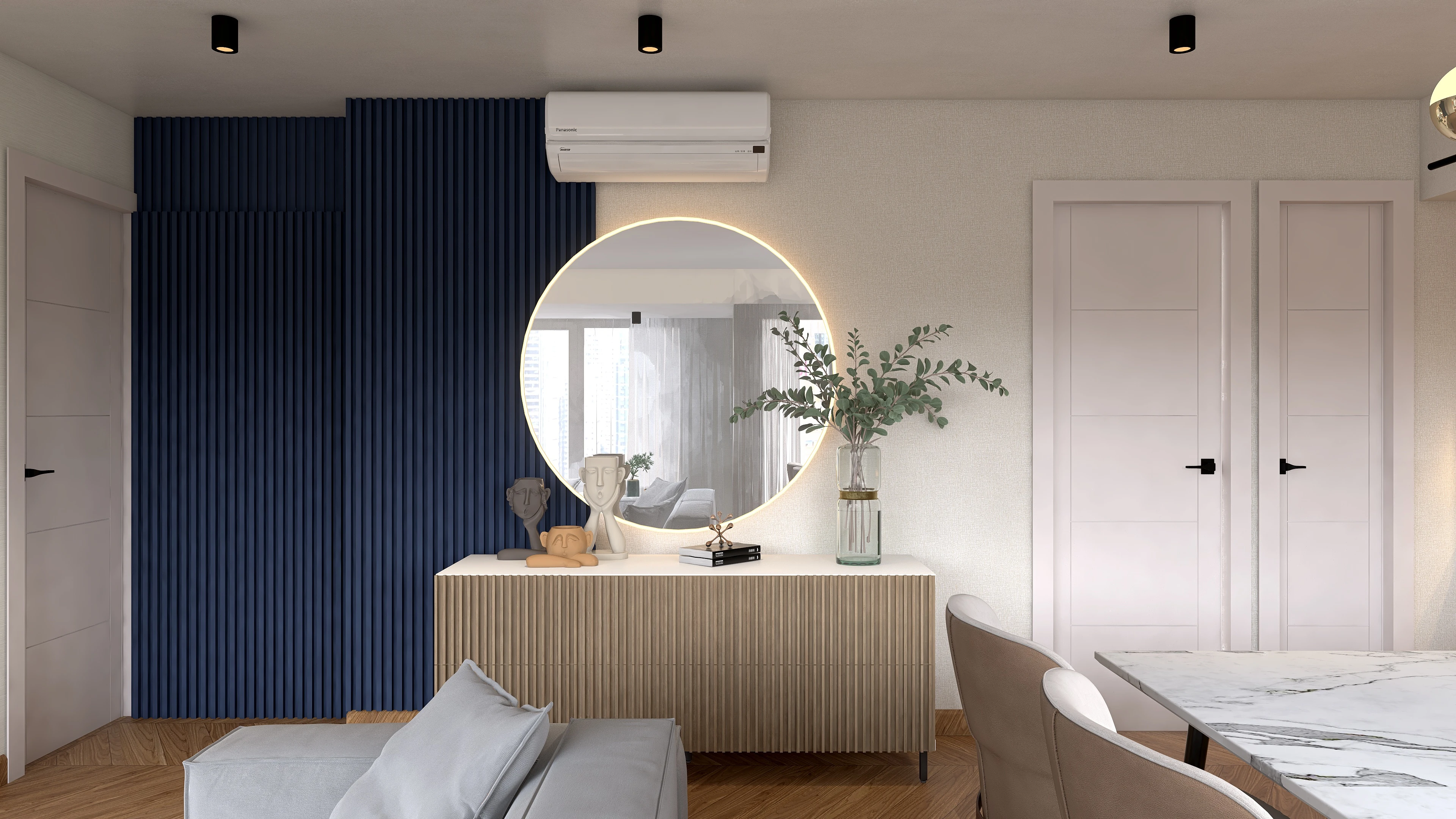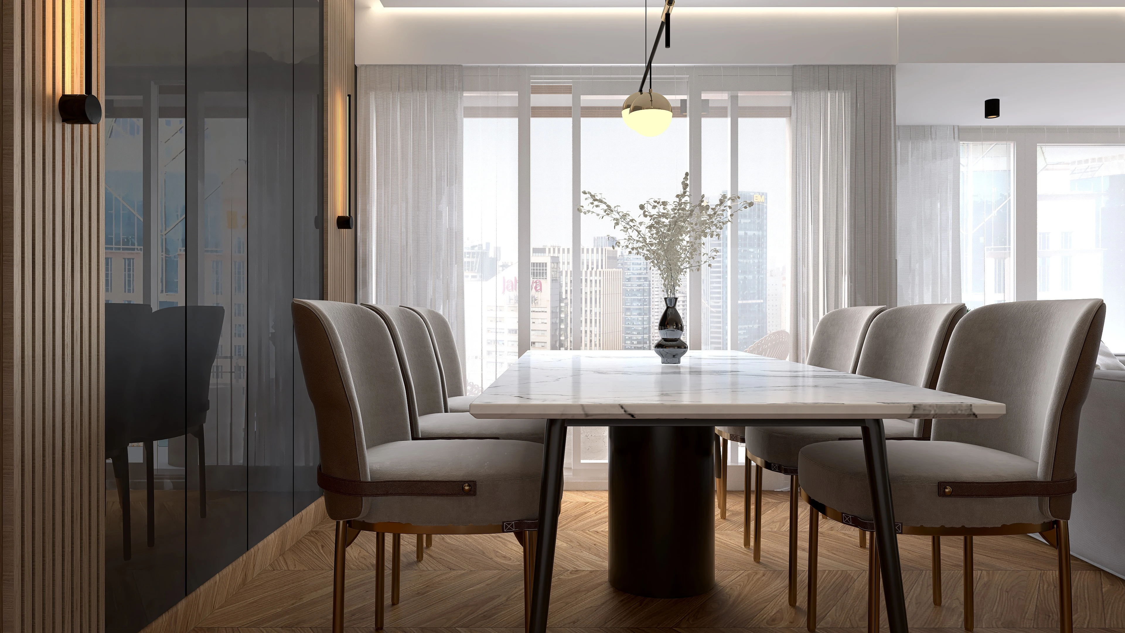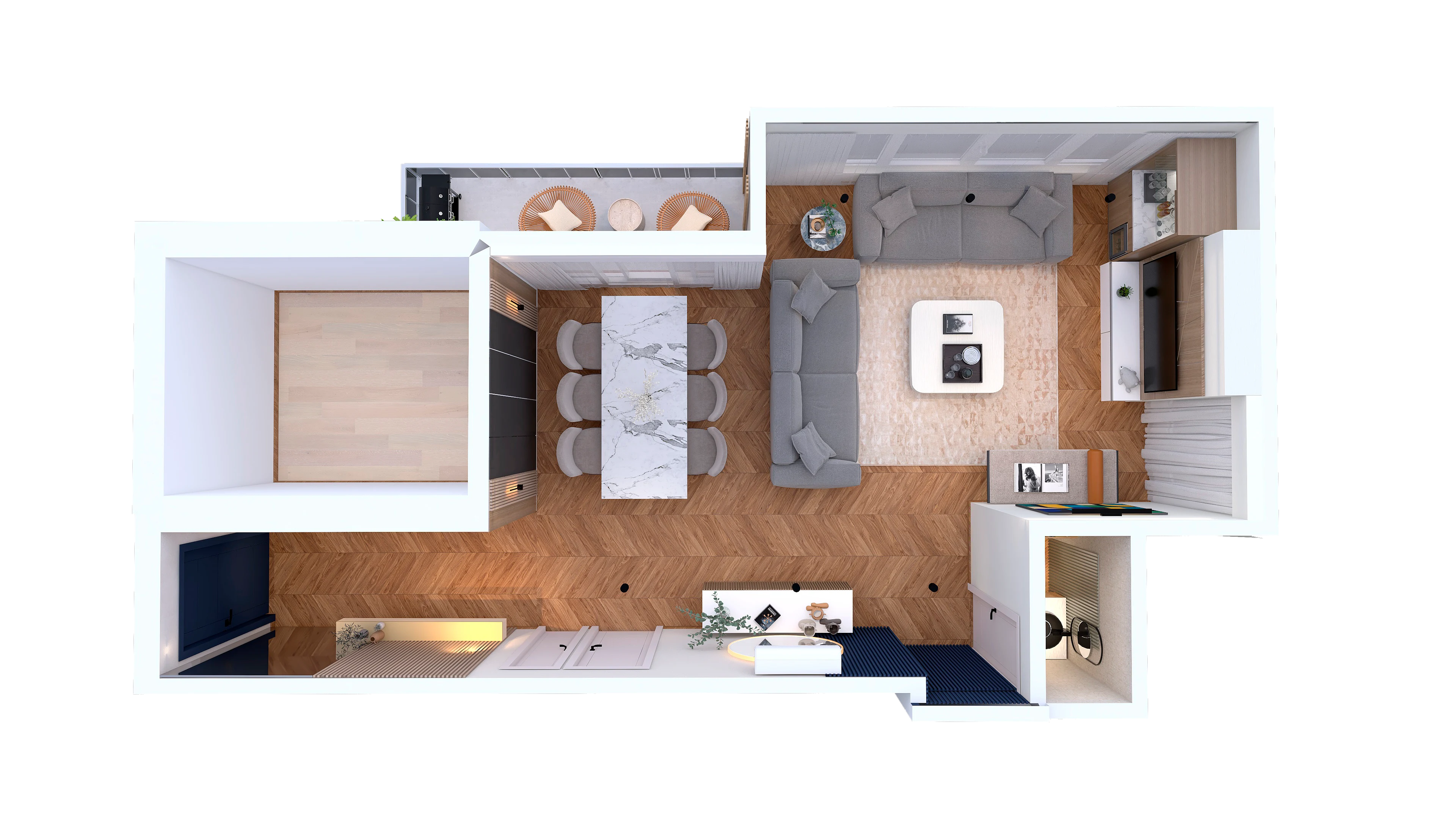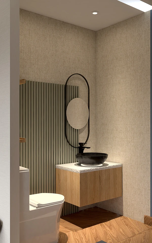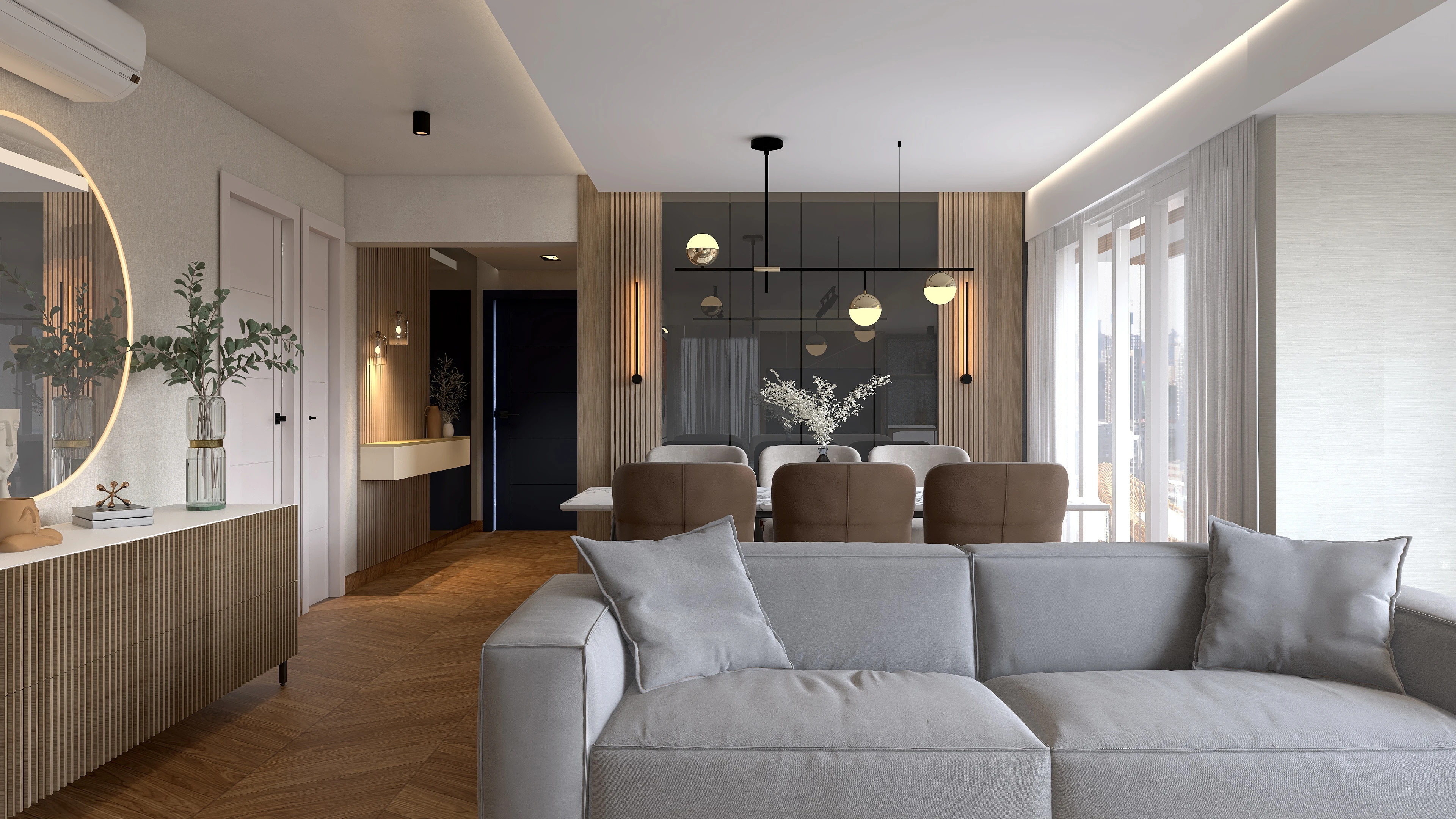 Un apartamento que busca encontrar un espacio auténtico y único con materiales naturales y tonos neutros. El objetivo principal es que el cliente sienta a gusto su espacio de entrada, sala-comedor, baño y balcon con elementos de su agrado como madera, marmol, tapices y colores neutros.