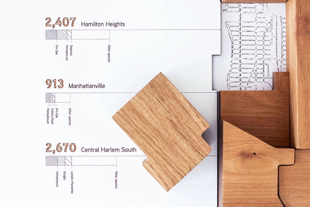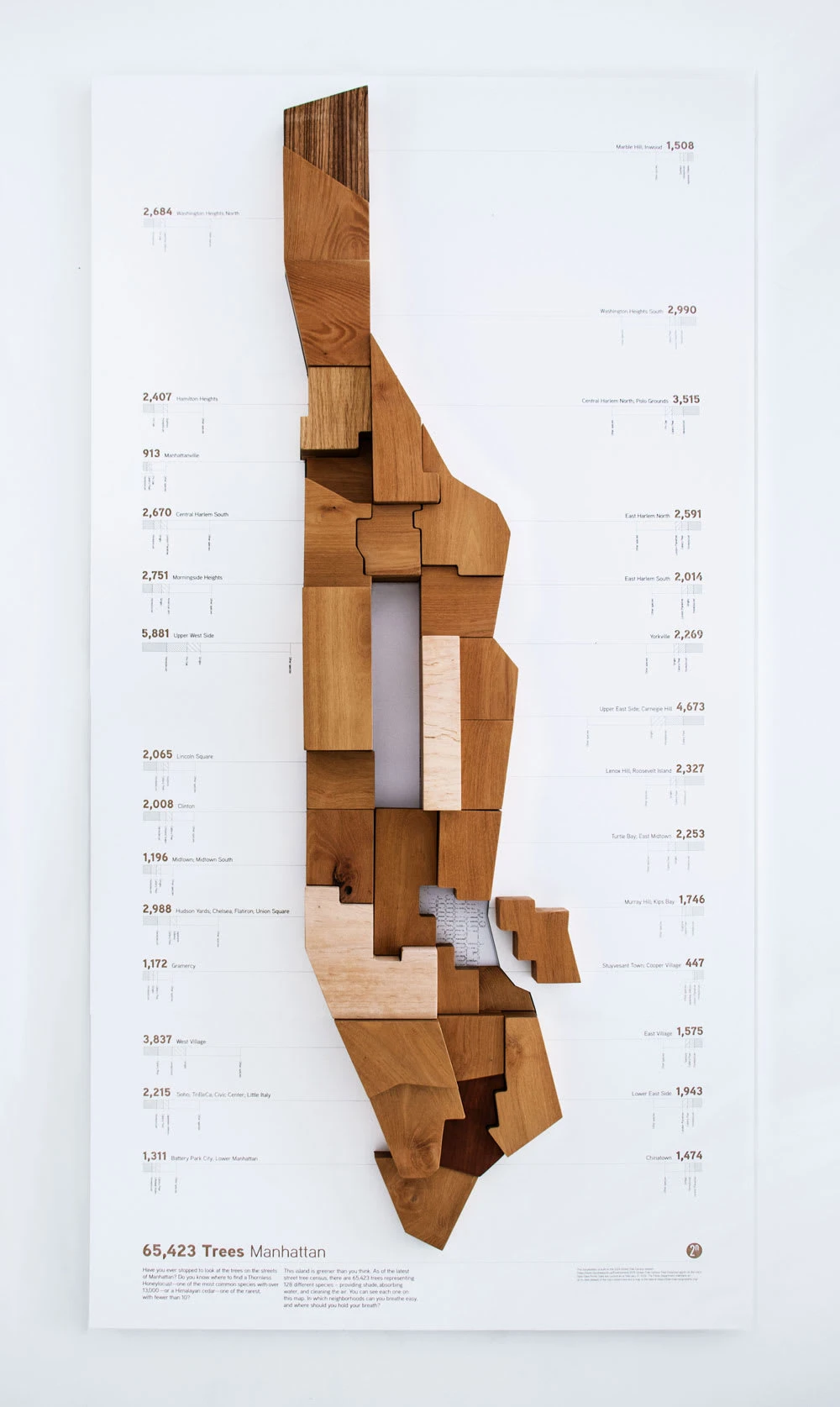 The Manhattan Tree Map is a wooden map based on the NYC Street Tree Census data. Each neighborhood is represented through a wooden block. It’s height signifies the amount of trees, whereas the wood represents the most prevalent tree. Beneath the blocks is a printed map with the exact geo-location of each tree.