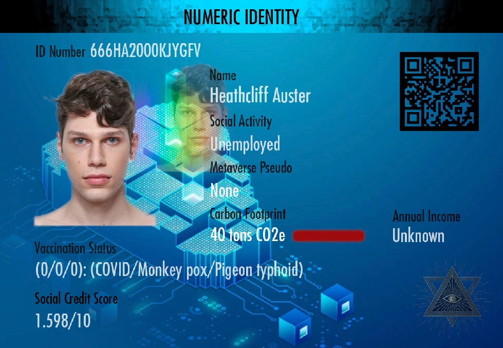 This futuristic identity card design uses Futura Condensed as the primary font, lending the text elements a clean, modern, and minimalistic aesthetic. Crafted in Adobe Photoshop, the card features layered effects and a holographic-inspired background, enhancing the digital and high-tech theme. Predominantly in shades of blue, the design creates a sleek and immersive digital environment with detailed metrics, social status, and a QR code that evokes data monitoring and digital identity themes.