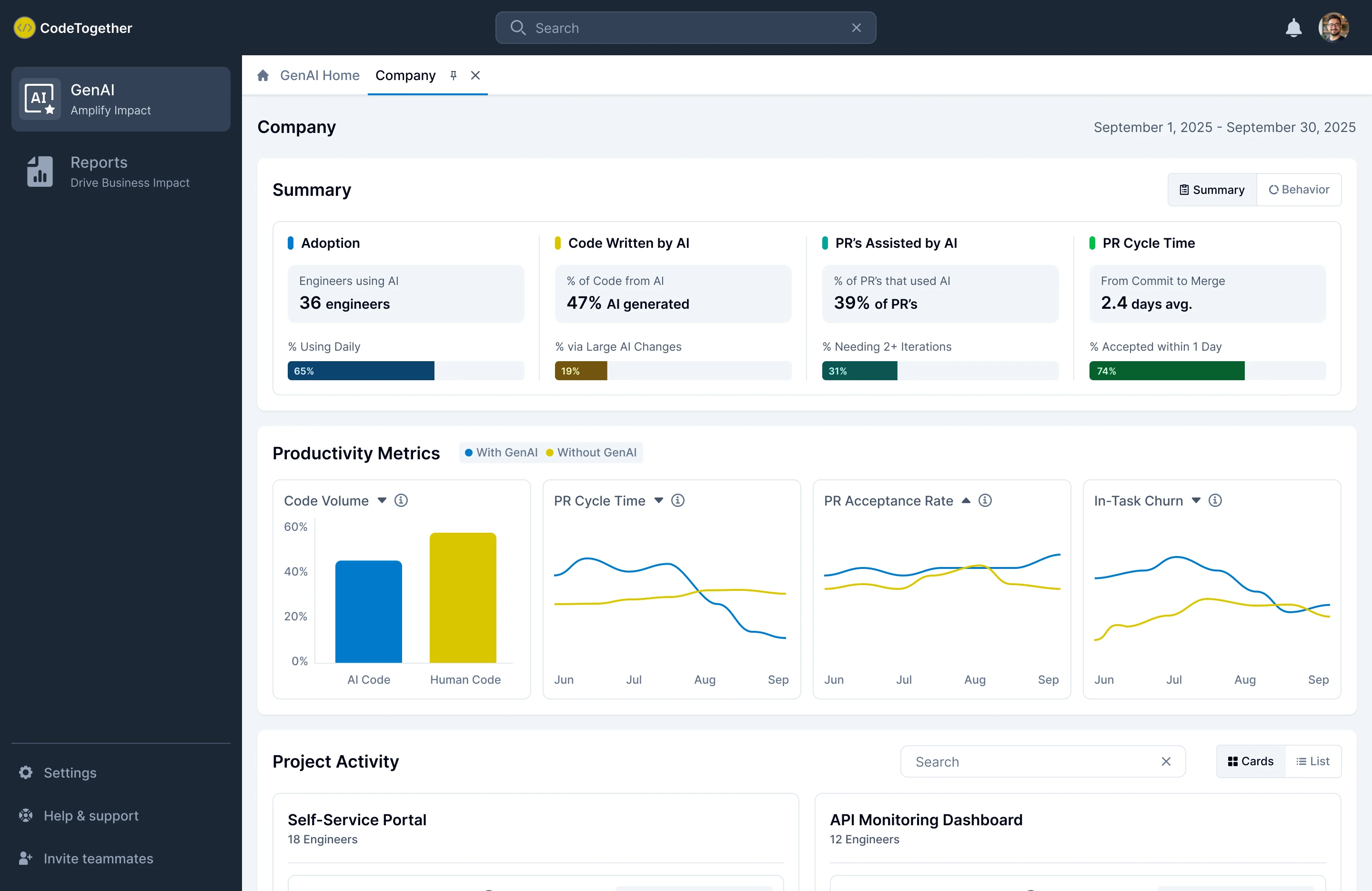 Designed the product experience for AmplifyGenAI, a platform that gives engineering leaders visibility into how AI is used across their organization. The dashboard reveals not just who’s using AI, but where and how it’s influencing productivity, from team-level adoption to individual workflow patterns. The interface was built to feel clean, data-driven, and easy to navigate, allowing users to move seamlessly from high-level insights to detailed activity views.
