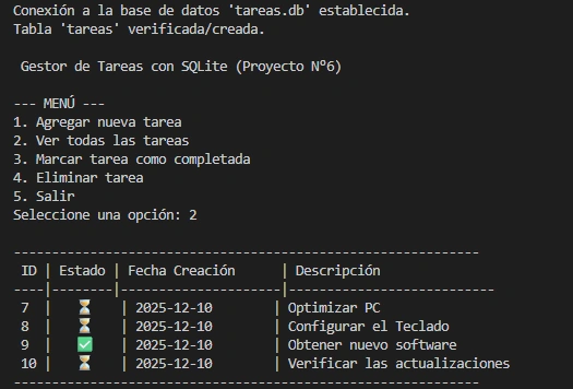 Built a console‑based task management application in Python that implements full CRUD operations (Create, Read, Update, Delete) using SQLite. The system allows users to add, view, update, and delete tasks, with all data securely persisted in a local database file (tareas.db).