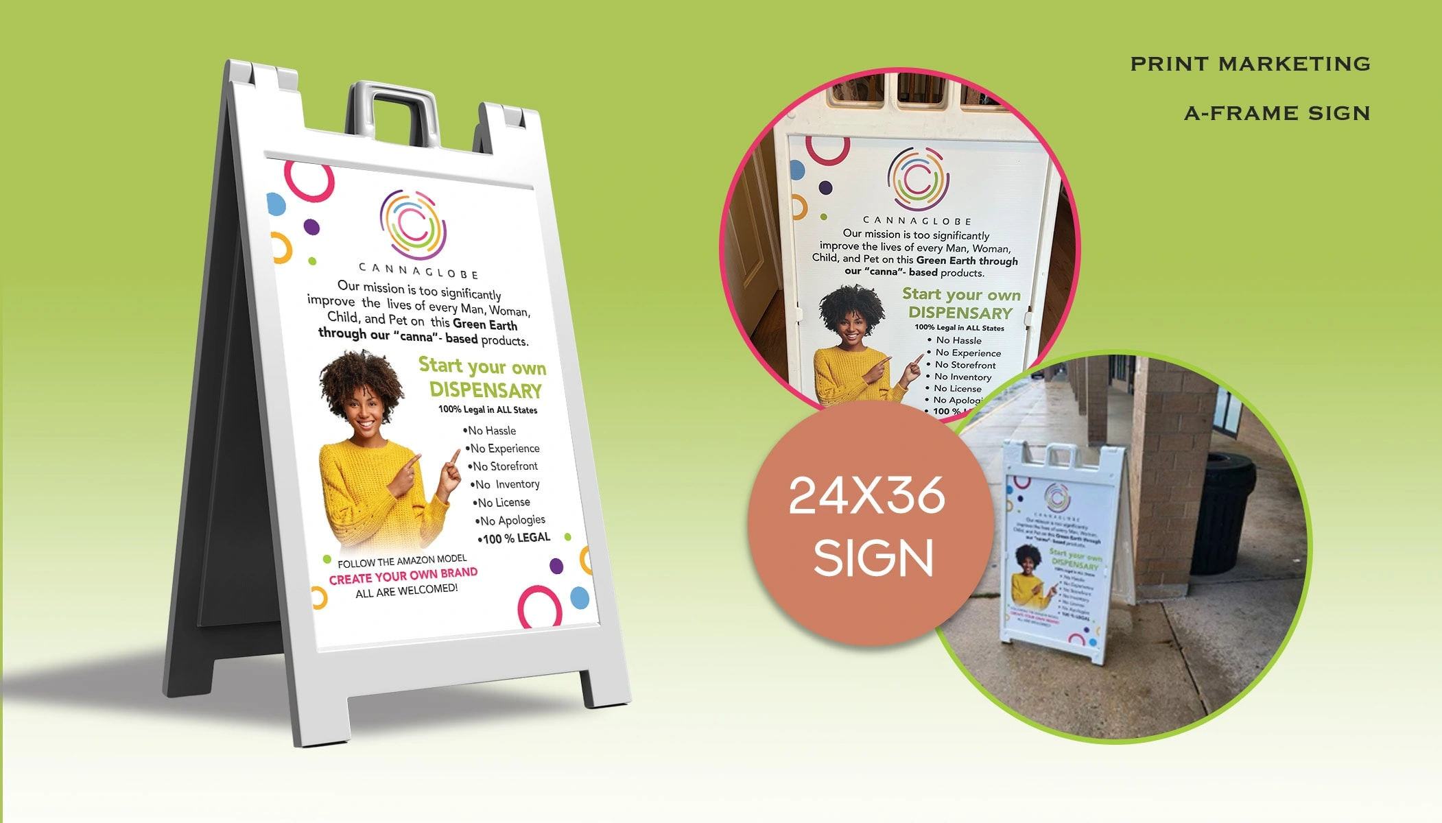 Created eye-catching A-frame signage for a cannabis business's special event using Adobe Creative Suite programs.